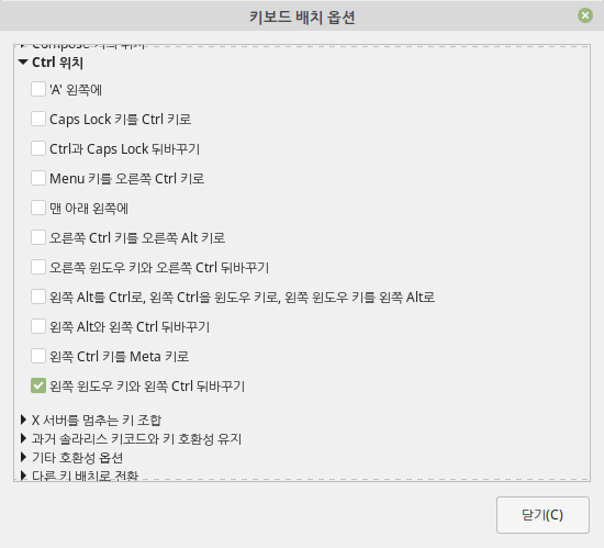 위 그림처럼 왼쪽 윈도 키와 왼쪽 Ctrl 뒤바꾸기를 선택하면 됩니다.
