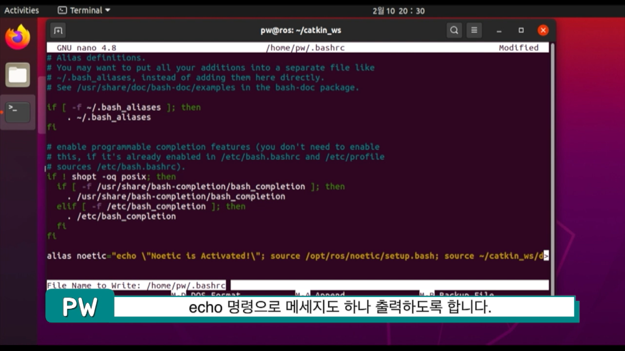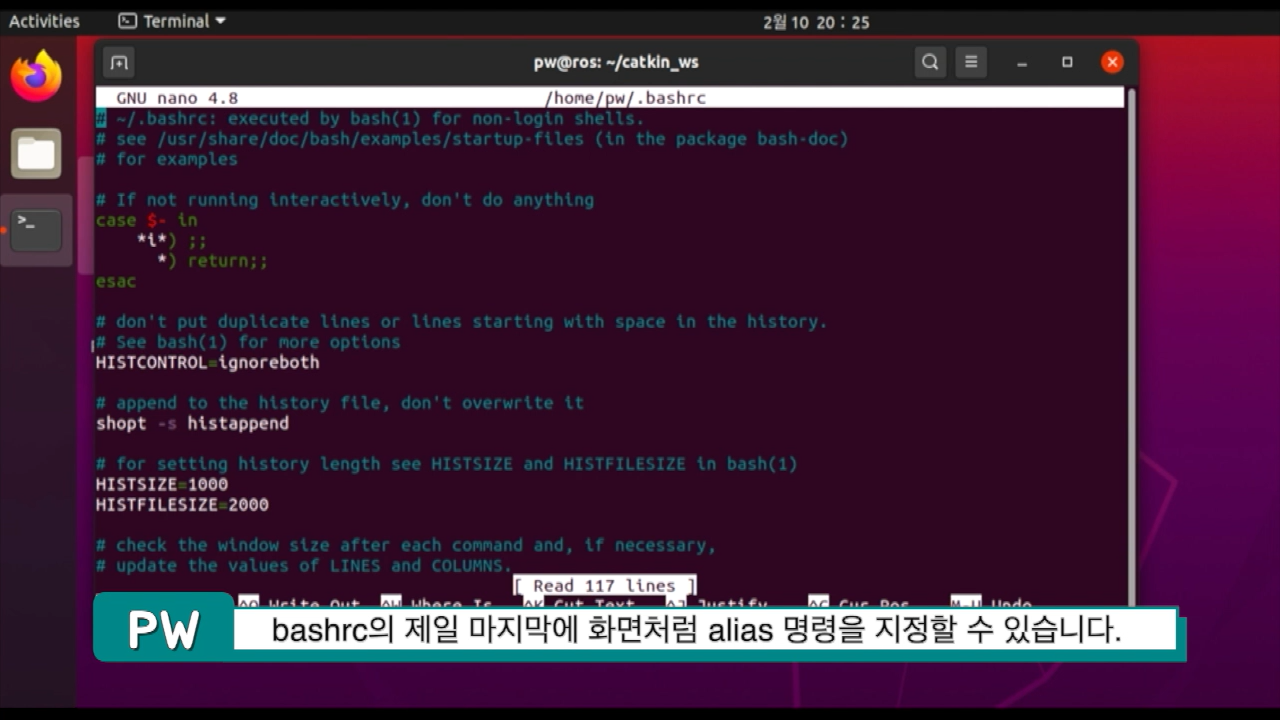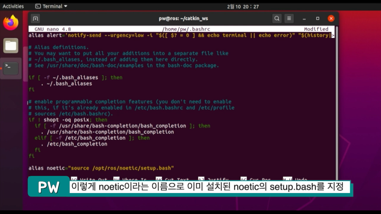 이제 nano ~/.bashrc를 통해 bashrc를 열어서 제일 마지막으로 가서 alias를 하나 지정할 겁니다. 이유는 우분투 20.04 부터는 아마도 ROS 유저들은 noetic과 함께 foxy를 사용하게 될텐데 한 터미널에서 ROS1과 2를 모두 설정할 수 없어서 각각 지정해야하거든요.