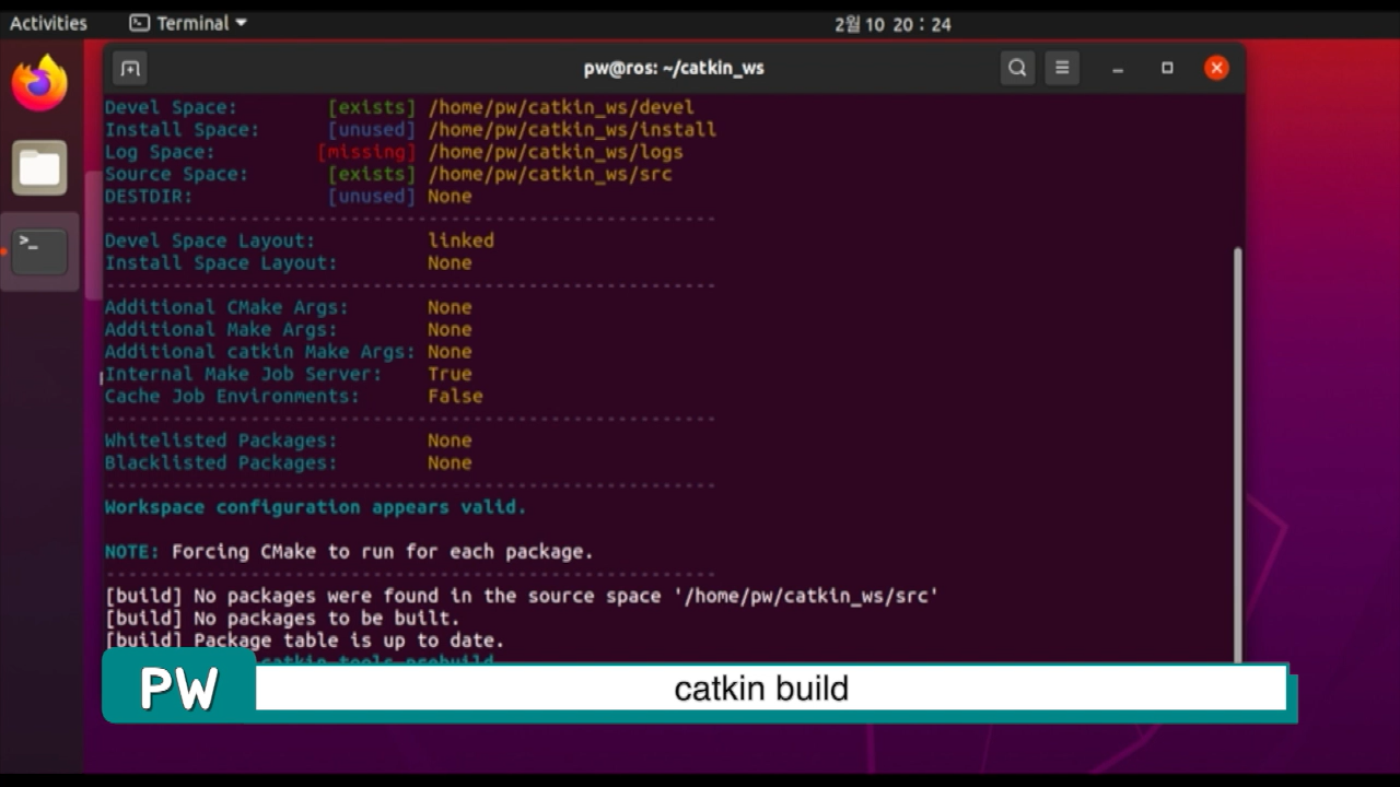 아무런 소스코드가 없어서 그냥 워크스페이스 폴더에서 catkin build를 수행해줍니다.