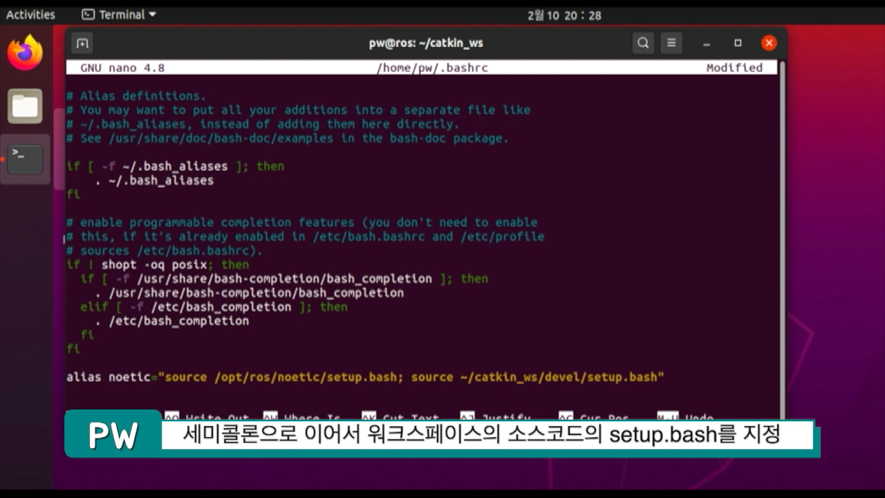 이제 nano ~/.bashrc를 통해 bashrc를 열어서 제일 마지막으로 가서 alias를 하나 지정할 겁니다. 이유는 우분투 20.04 부터는 아마도 ROS 유저들은 noetic과 함께 foxy를 사용하게 될텐데 한 터미널에서 ROS1과 2를 모두 설정할 수 없어서 각각 지정해야하거든요.
