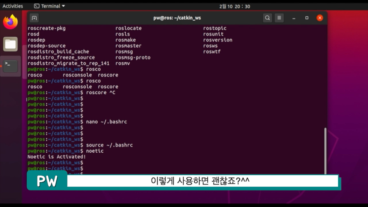 그리고 noetic이라고 명령만 호출하면 됩니다. 대충 noe까지 치고 탭키를 입력하면 됩니다.