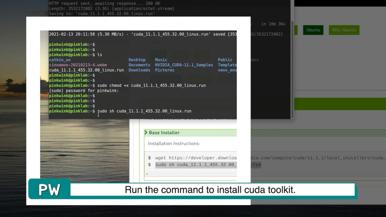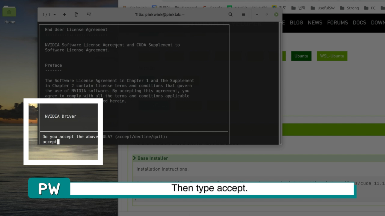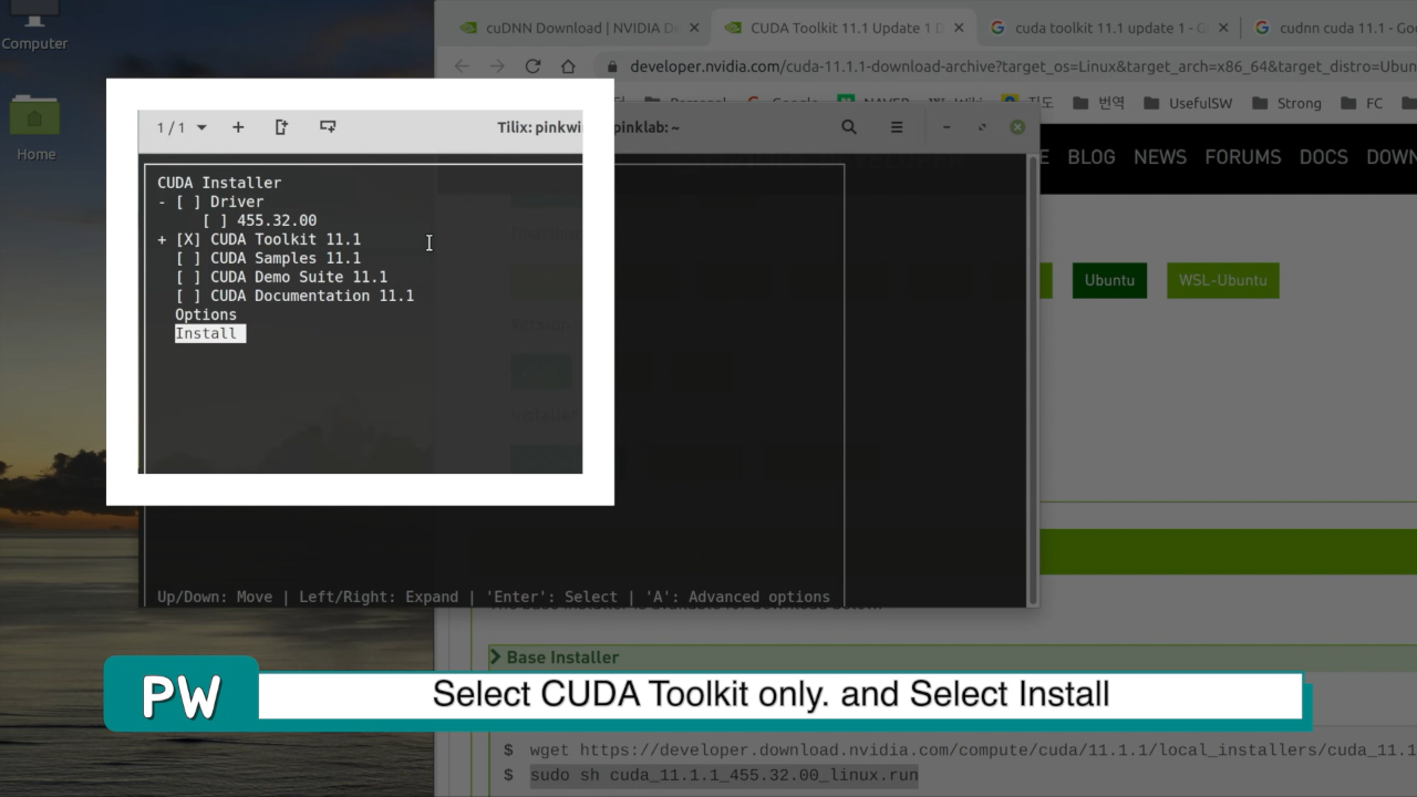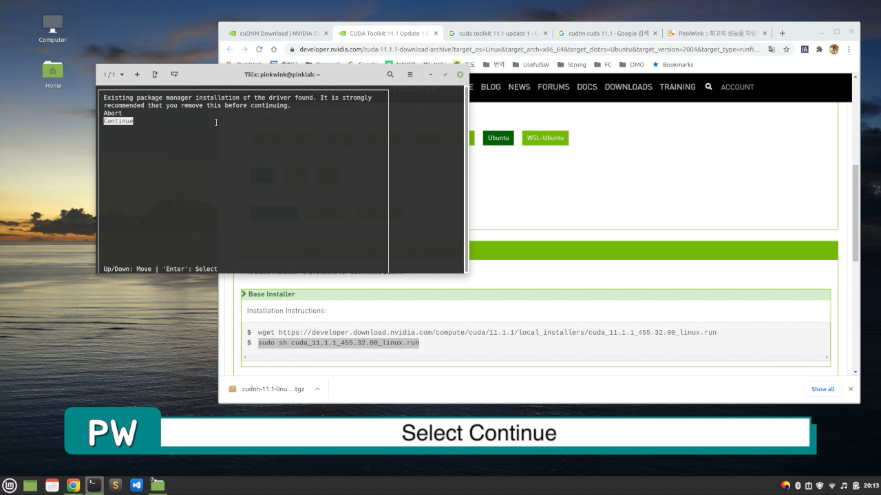 뭐 드라이버를 설치하지 않았다면 드라이버를 누르고, 아니면 위 그림처럼 선택해서 설치하면 됩니다. 저는 별도로 이 영상의 설치가 진행되기 전에 sudo apt install nvidia-driver-460 명령으로 드라이버를 이미 설치했습니다.