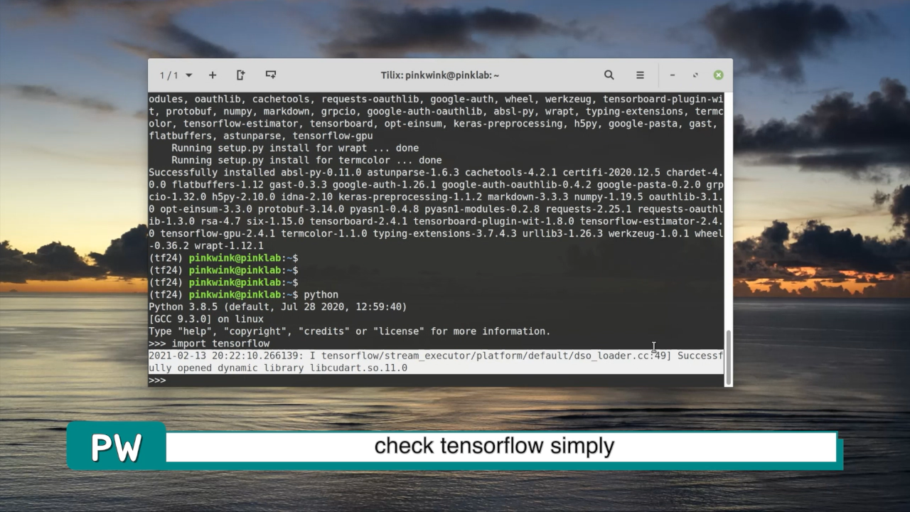 간단히 python으로 들어가서 tensorflow를 import해서 위와 같은 메세지가 나오면 됩니다.