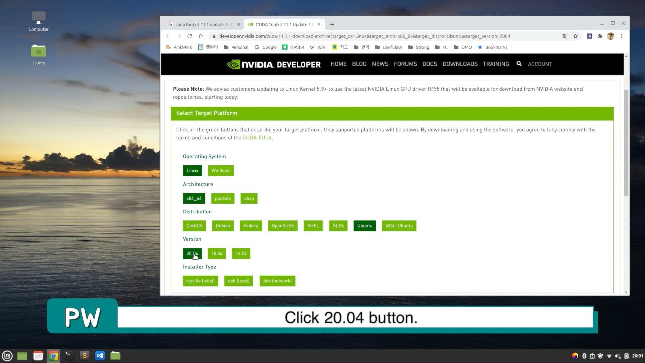 위 그림처럼 Linux -> x86_64 -> Ubuntu -> 20.04를 차례로 선택합니다.
