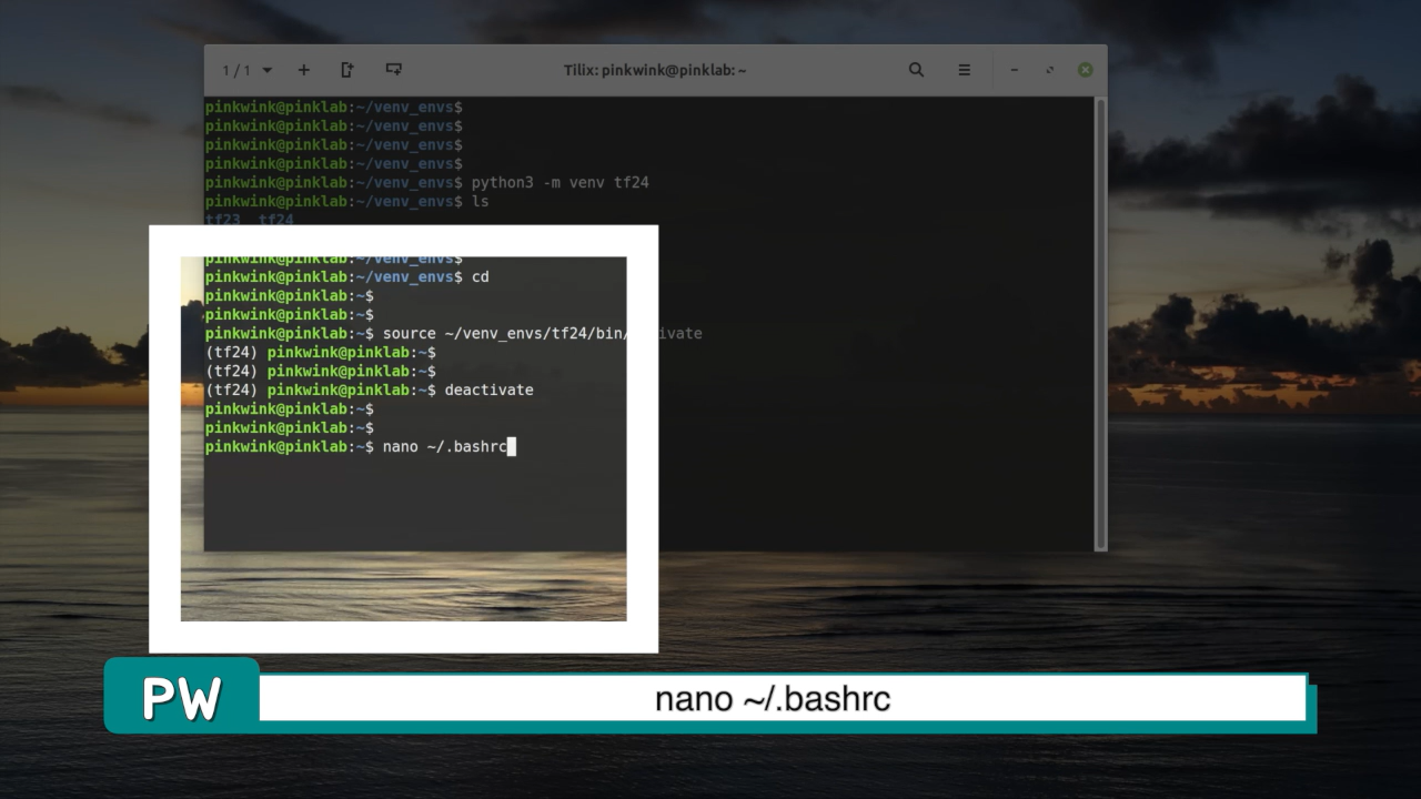 위 화면에 보이는 alias tf24라고 시작하는 줄을 입력해 둡니다. 이제 터미널에서는 앞으로는 tf24라고 명령을 주면 됩니다.