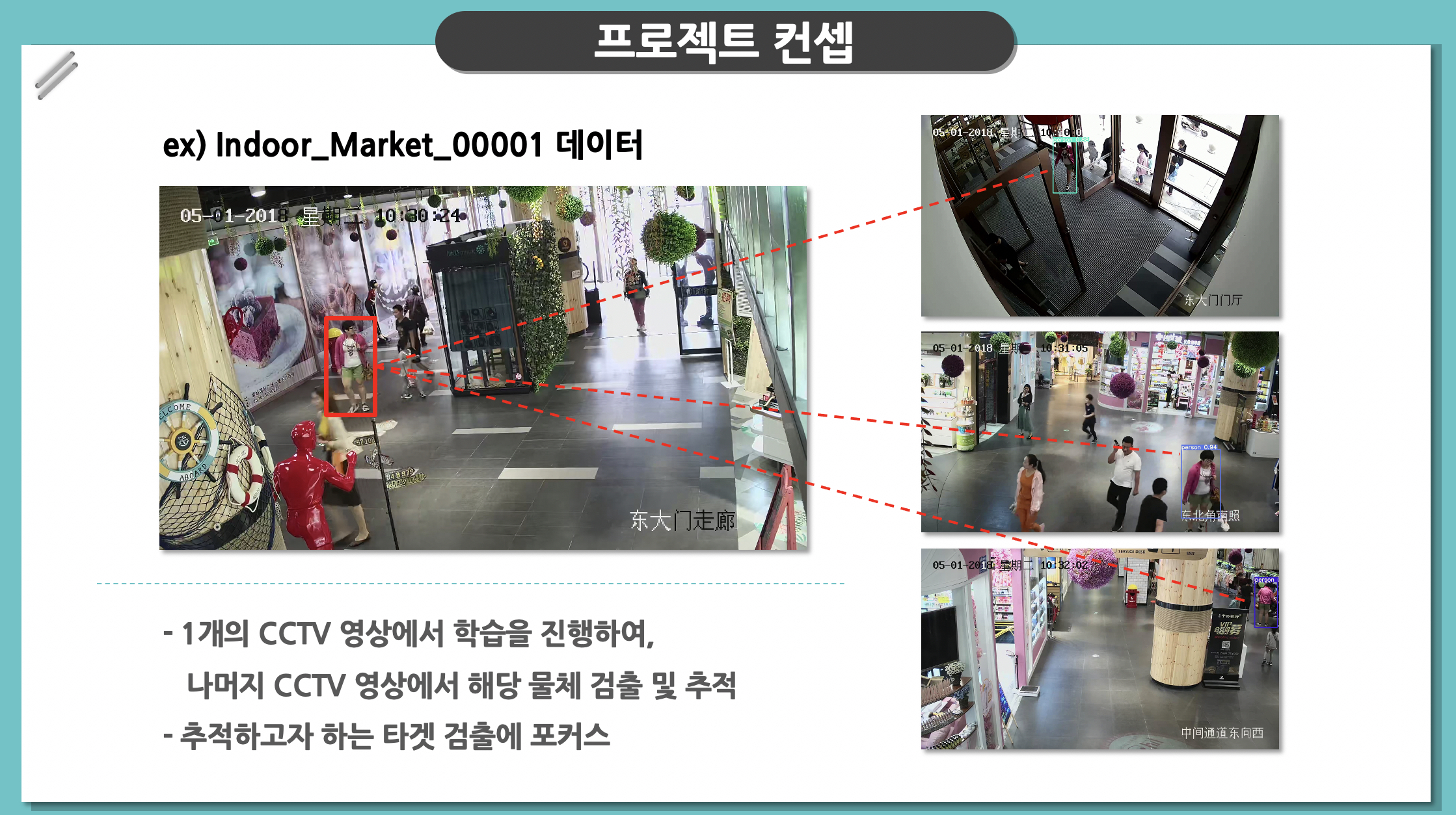 목표는 한 사람에 대한 CCTV 데이터가 5개 정도 있다면, 적은수의 영상 클립만 학습에 이용하고 나머지 영상 클립에서 그 사람을 찾는 것이죠.