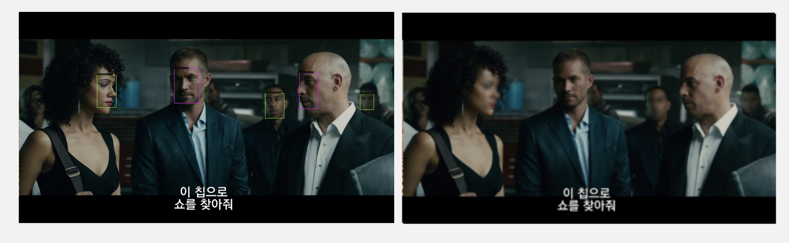 첫 팀은 영상속에서 원하는 특정인물의 얼굴만 놔두고, 그 주변 인물들은 모두 얼굴 부분만 blur 처리를 하는 것이 목표였습니다.