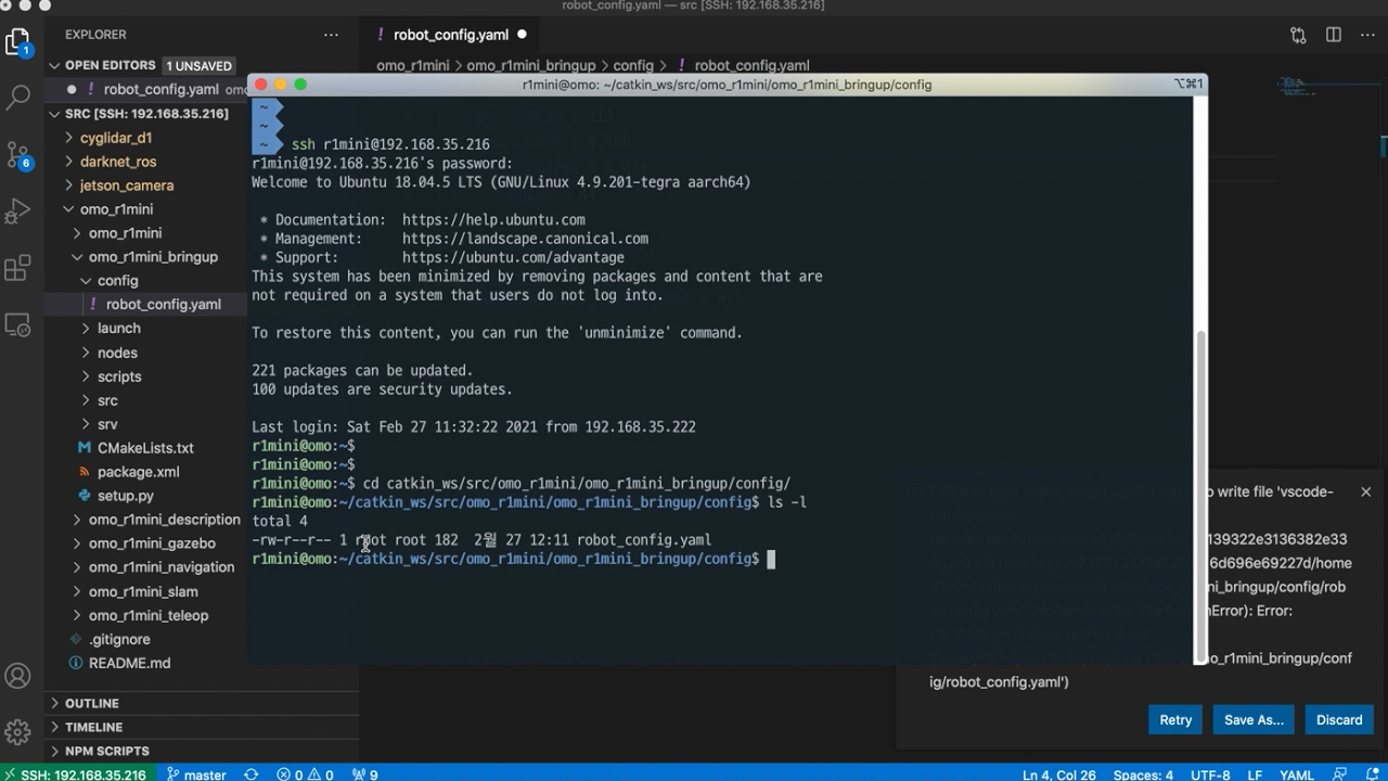 예전에 저는 VSCODE를 이용해서 SSH로 젯슨 나노나 라즈베리파이에 접근하는 방법을 이야기했었는데요. 그렇게 쓰다보면 아주 가끔 권한 문제로 파일을 저장할 수 없다는 에러가 날 수 있습니다. 해당 문장은