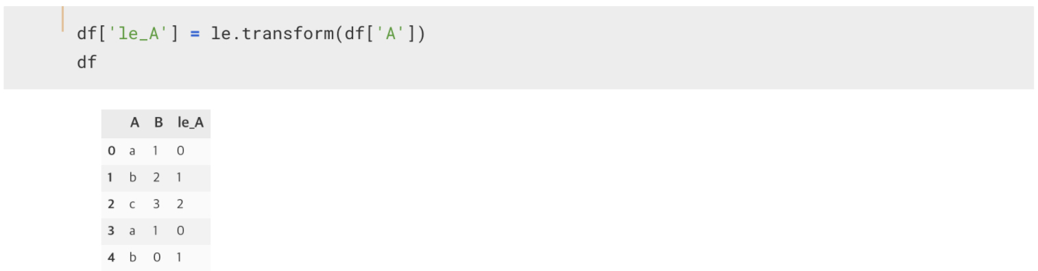 이제 transform 명령을 이용하면 fit에서 정해진 규칙대로 변환이 됩니다. 변환이 된것을 le_A라는 컬럼에 저장해서 보면 저렇게 되죠.