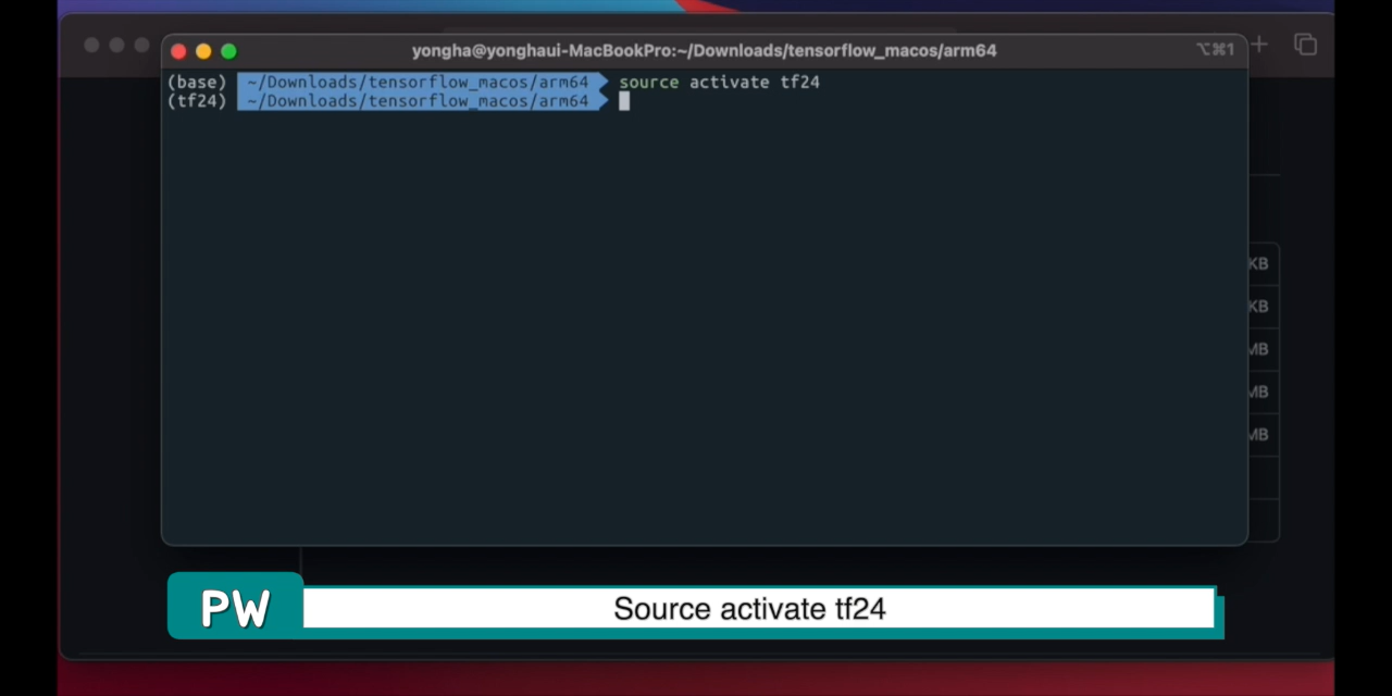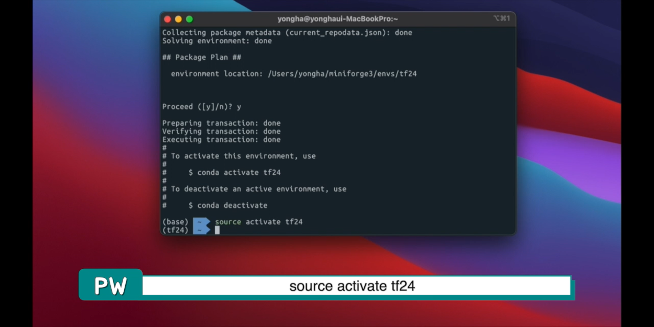 만든 tf24라는 환경으로 source activate 명령으로 들어갑니다. 어떤 경우는 source라는 명령이 안 먹고 conda라는 명령을 사용해야하는 경우도 있습니다.