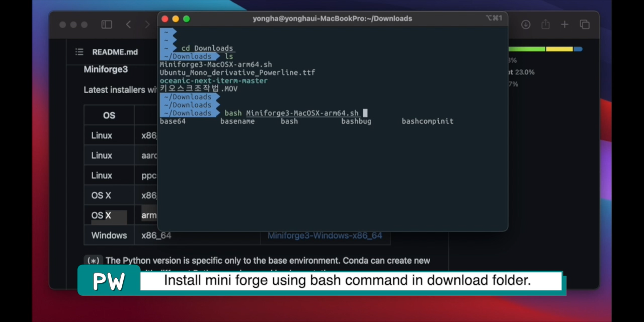 다운로드 폴더로 가서 bash 명령으로 다운받은 sh 파일을 실행합니다.