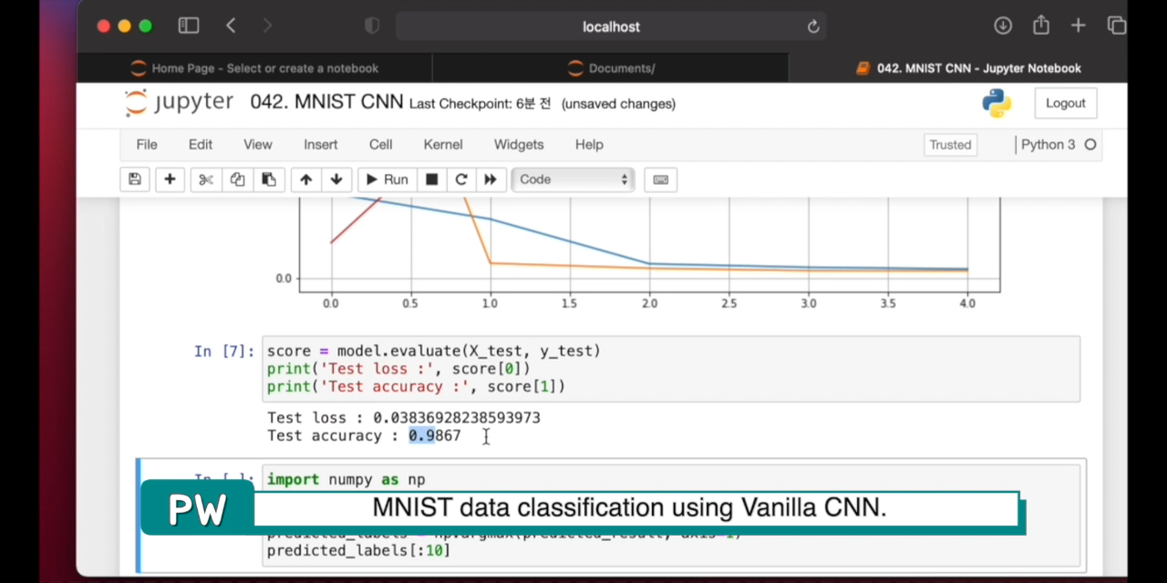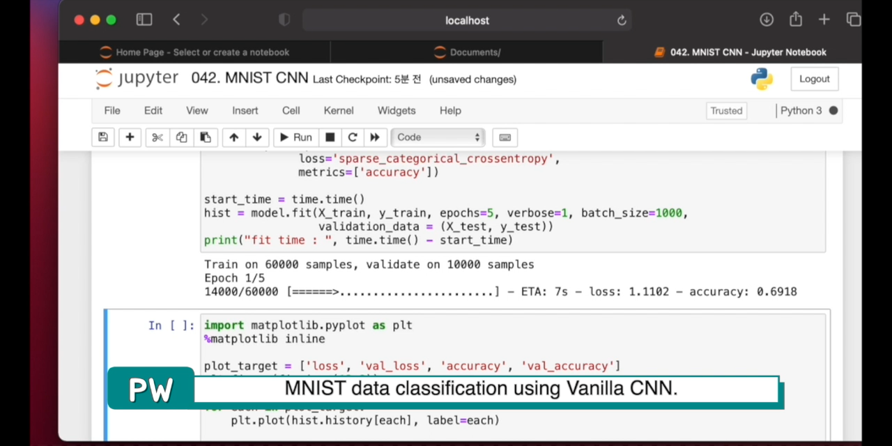 해당 코드는 mnist 데이터를 간단한 CNN 모델로 돌려보는건데요. 잘 동작하네요^^