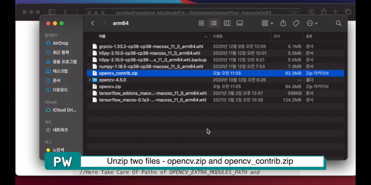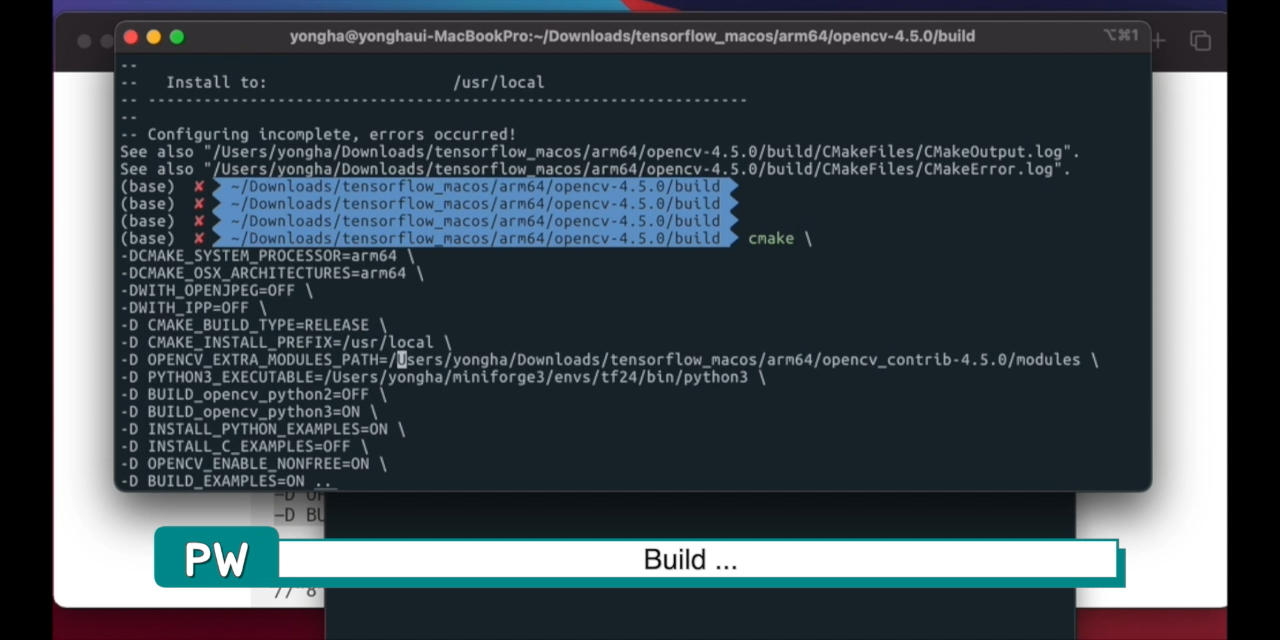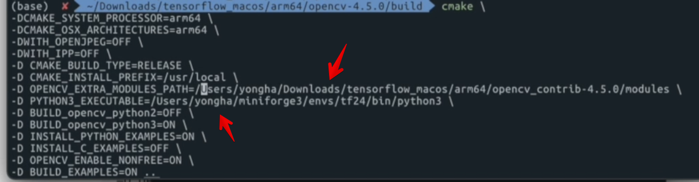 위 화살표에 표시된 두 부분, 하나는 opencv-contrib의 압축을 푼 경로와 또 다른 화살표는 username인데 이 두부분을 주의해서 수정해주면 됩니다. 그리고 실행하면 됩니다.