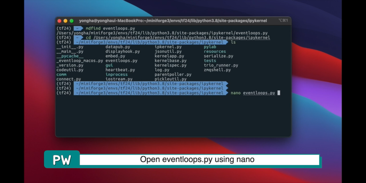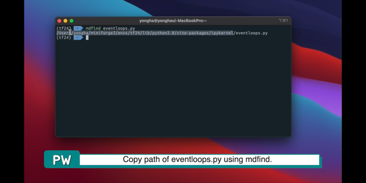이 부분은 살짝 나중에 텐서플로우를 실행했을때 에러가 나는 경우만 사용하면 되지만, 순서상 지금 이야기를 합니다. 일단 mdfind 명령으로 eventloops.py 파일의 경로를 찾아서