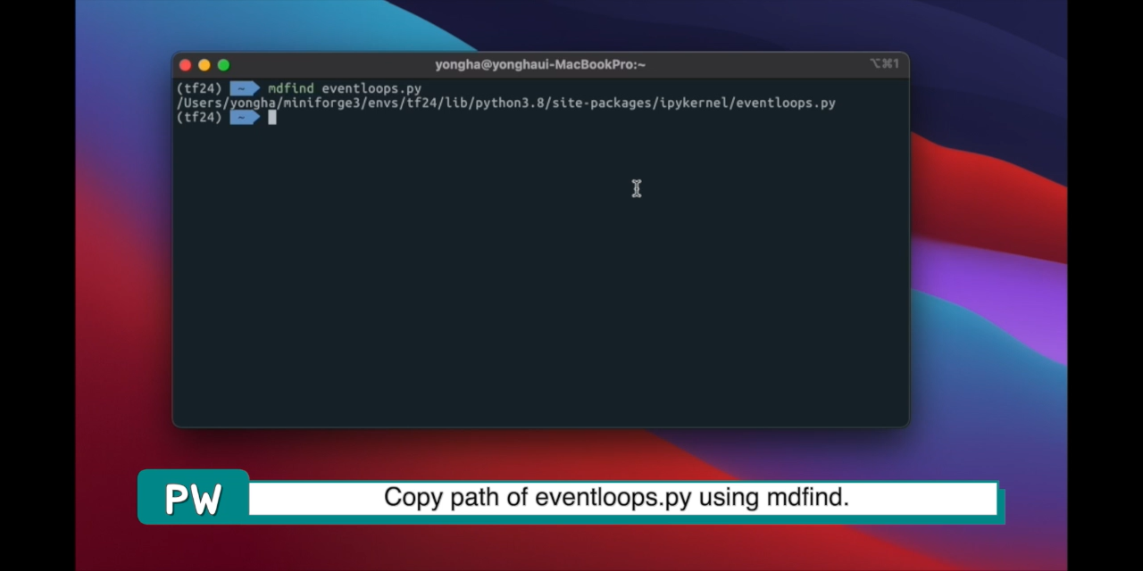 이 부분은 살짝 나중에 텐서플로우를 실행했을때 에러가 나는 경우만 사용하면 되지만, 순서상 지금 이야기를 합니다. 일단 mdfind 명령으로 eventloops.py 파일의 경로를 찾아서