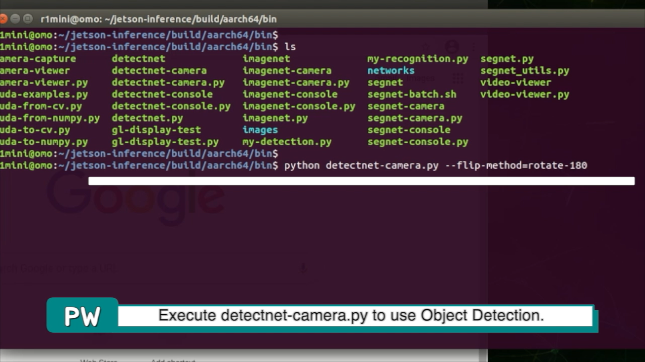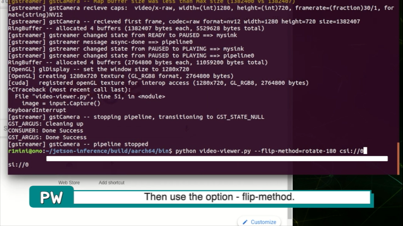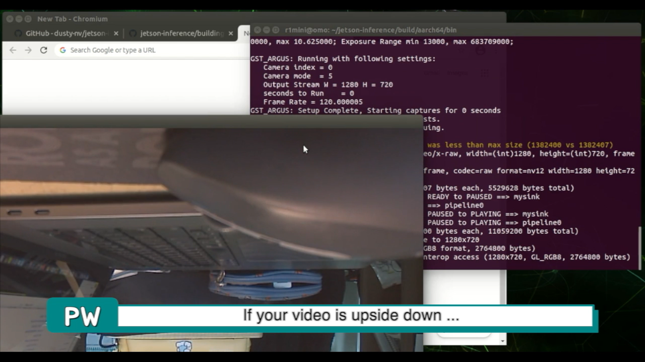 이번에는 detect-camera.py 코드를 --flip-method=rotate-180 옵션으로 실행하겠습니다. flip-method 옵션은 영상이 뒤집혀 보일때만 사용하세요.