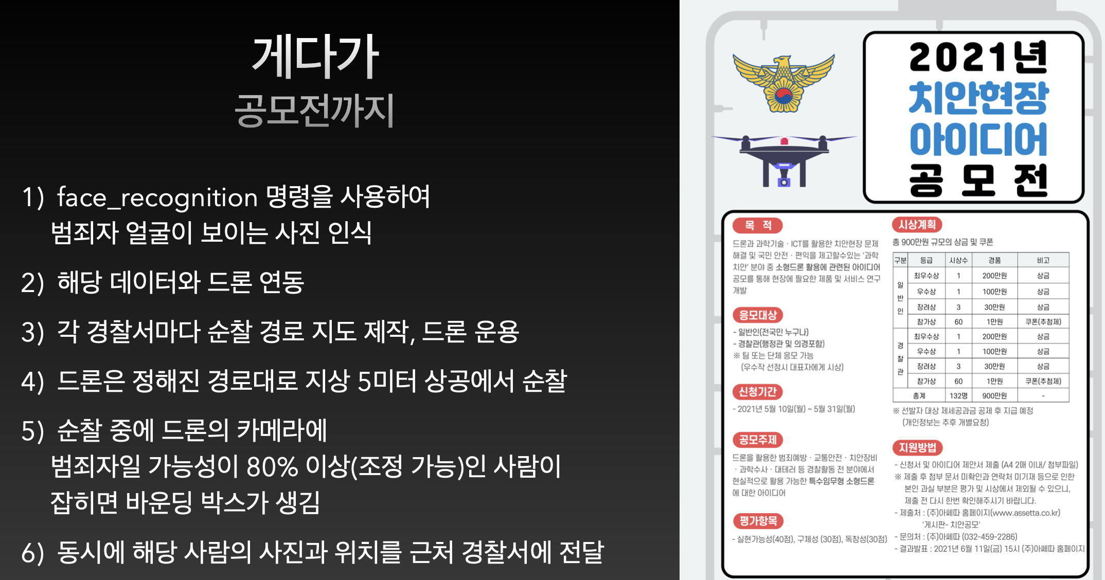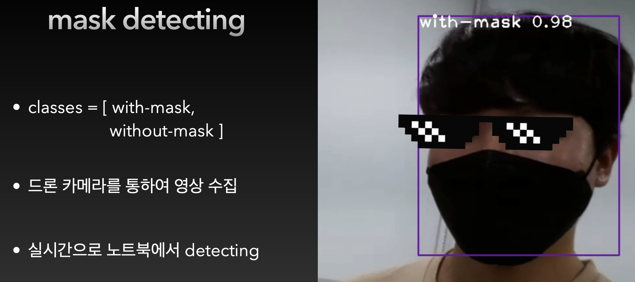 일단, 먼저 이 친구들이 도전한 것은 마스크쓴 사람과 안쓴 사람을 구별해서 안쓴사람이 인지되면 드론이 움직이는 것입니다.