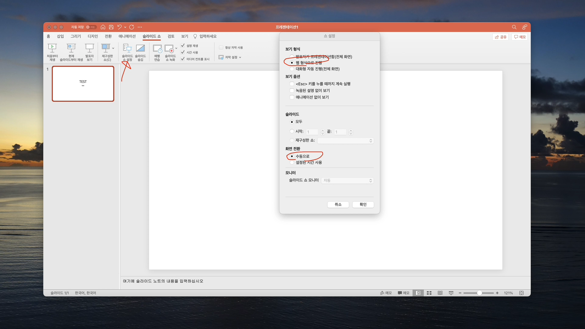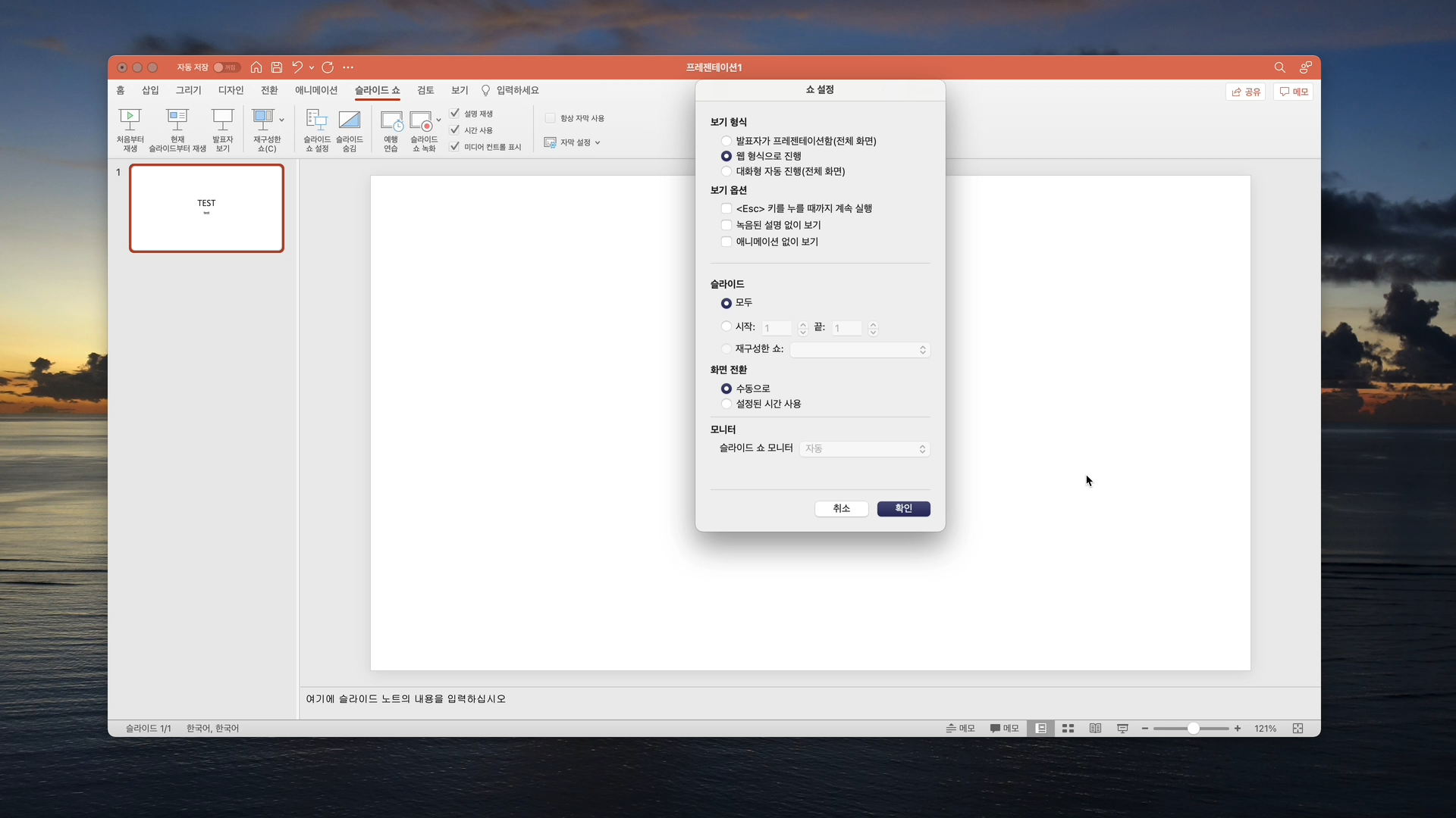 슬라이드 쇼에서 슬라이드쇼 설정을 선택합니다. 그러면 설정창이 나타나는데요