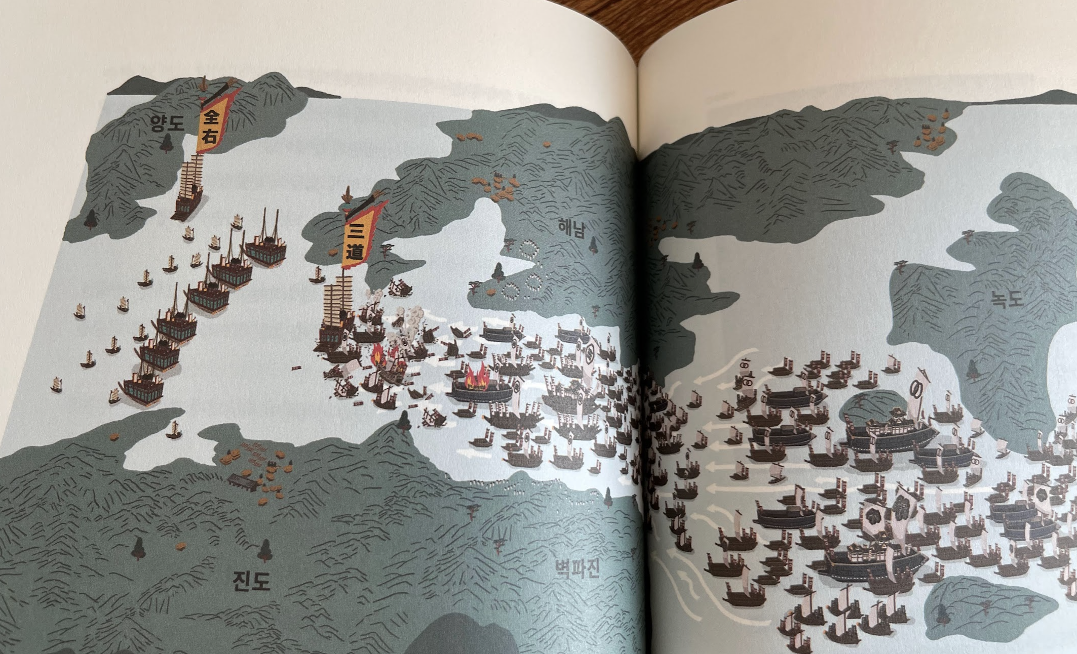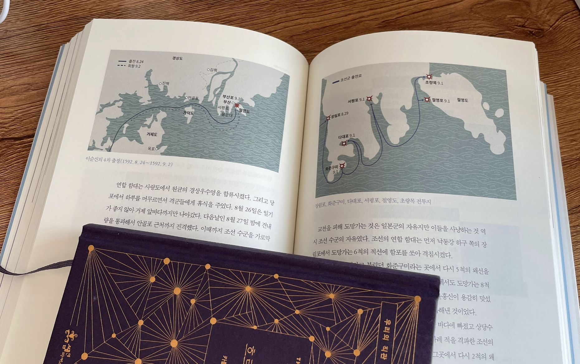 이순신의 바다에서 큰 장점은 모든 전투를 저렇게 멋지게 진행 경로를 그려주고 있다는 것입니다. 지도 위에서 어떻게 이동했고 어떤 바다에서 싸웠는지를 보여줍니다. (아.. 사진을 찍기 위해 바쳐둔 책은 "시간은 흐르지 않는다"라는 책인데, 이것도 곧 리뷰를 올리겠습니다.^^)
