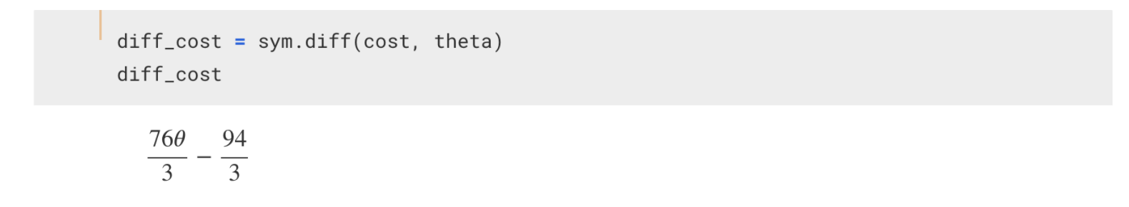 위 그림의 코드처럼 theta를 sympy의 Symbol로 지정하면 문자 연산이 가능해집니다. 나는 원점을 지나는 직선을 가정했으므로 theta*x가 되고, theta를 문자(Symbol)로 지정했으므로 위 글미처럼 각 x 데이터(2, 3, 5)에 대해 각각 theta가 곱해져서 나타나게 됩니다.