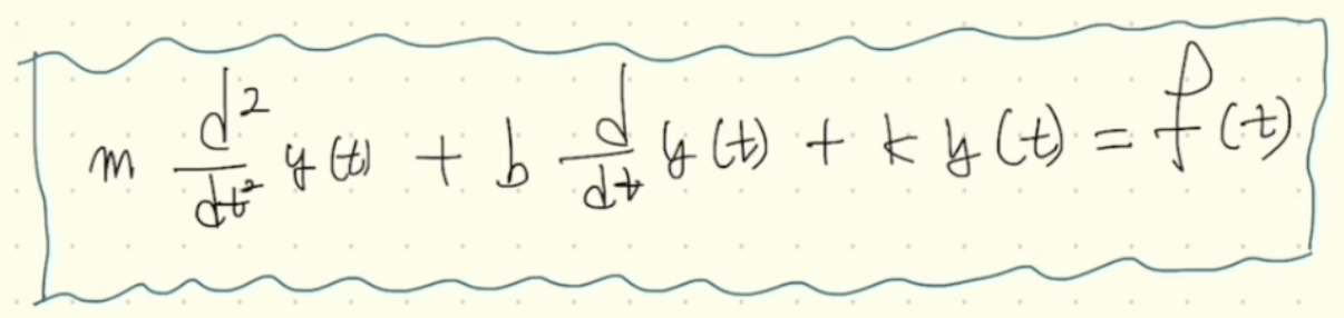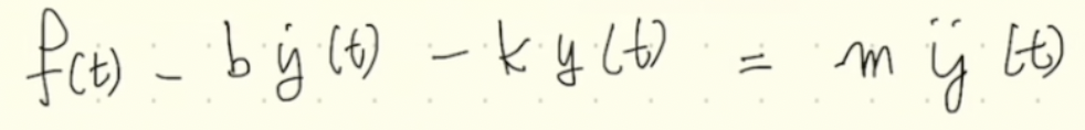 힘의 관계를 위와 같이 다 정리했습니다. 결국 내가 저 질량을 당기는 힘 f(t)에서 스프링과 댐퍼가 버틴 힘을 빼면, 질량(m)을 움직이는 힘이 되겠죠. 그 질량을 움직이는 힘은 움직인 거리 y(t)를 두번 미분한 가속도 성분이 질량 m과 곱해진 값입니다. 뉴턴의 제2법칙이죠.