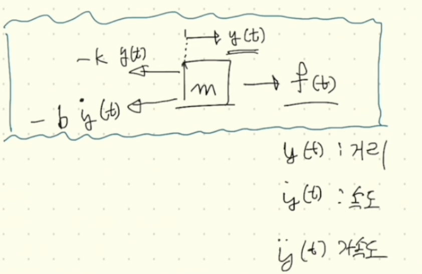 스프링 - 매스 - 댐퍼 시스템을 다 정리하면 위 그림과 같이 되는데요. 스프링은 거리값에 비례하는 것입니다. 아. 위 그림에서 k와 b는 각각 스프링 상수이고 댐퍼 상수입니다. 지금 그림에서 b와 k에 마이너스 - 기호가 붙어있는데요. 이는 방향을 설명하기 위한 것으로 실제로는 화살표의 방향을 f(t)의 반대로 잡았기 때문에 저 그림에서는 마이너스 부호가 없어야합니다. 그러나 아래의 식에서는 - 부호가 맞습니다.