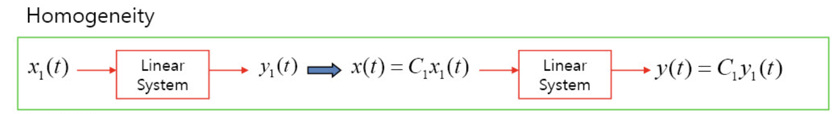Homogeneity는 어떤 입력의 결과가 있을때, 다시 그 입력에 상수배를 취해서 입력하면 그 결과도 딱 상수배만큼 되어서 나타난다는 것입니다.