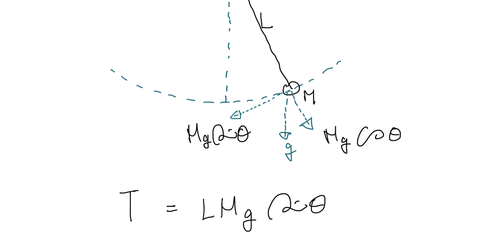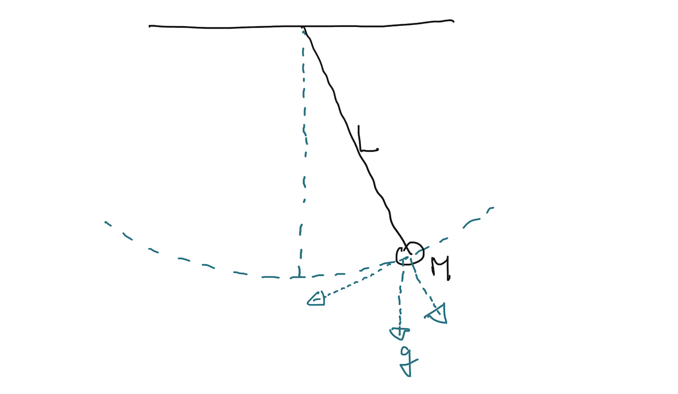 이렇게 생긴 시스템이 있다고 보겠습니다. 진자(pendulum)가 실에 매달려 흔들거리는 거죠. 이때 질량(M)이 있는 진자는 접선의 방향으로 힘을 가지게 됩니다. 접선에 수직한 방향으로의 힘은 실의 장력과 함께 사라지구요.