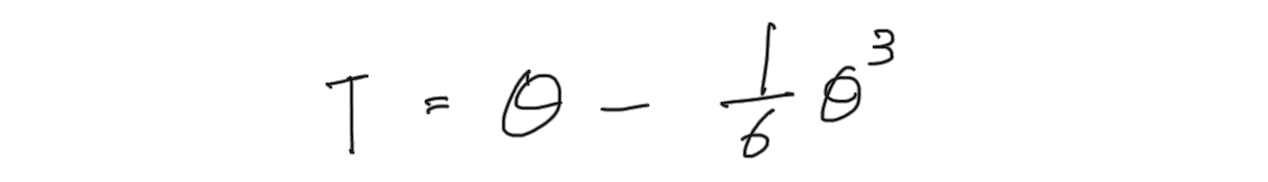 그러면 토크(T)는 위 식처럼 표현할 수 있고, LMg를 그냥 1이라고 가정해버리면, 진자의 토크 식은