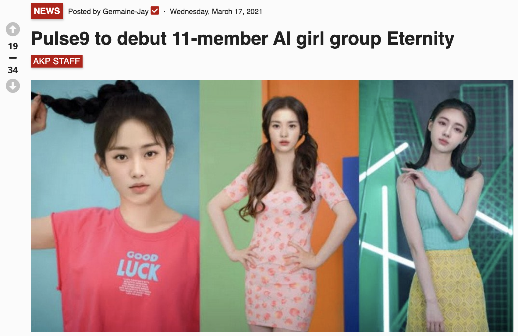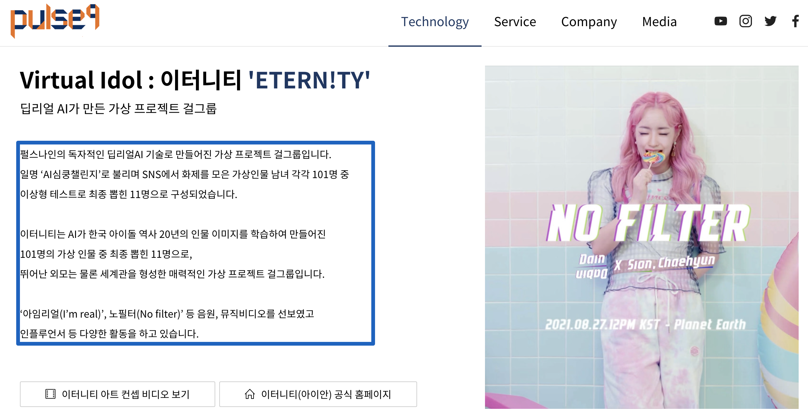 펄스나인의 작품도 함께 소개를 받았습니다. 바로 이터니티 Eternity 입니다. 위 영상은 4월 29일 공개 후 4일만에 220만뷰를 넘는 기염을 토했습니다. 특히 댓글들을 보면 외국인들의 반응도 좋은 것으로 보입니다. 네... 영상을 보신 분들은 아시겠지만, 이터니티는 인공지능으로 만든 가상의 걸그룹입니다.