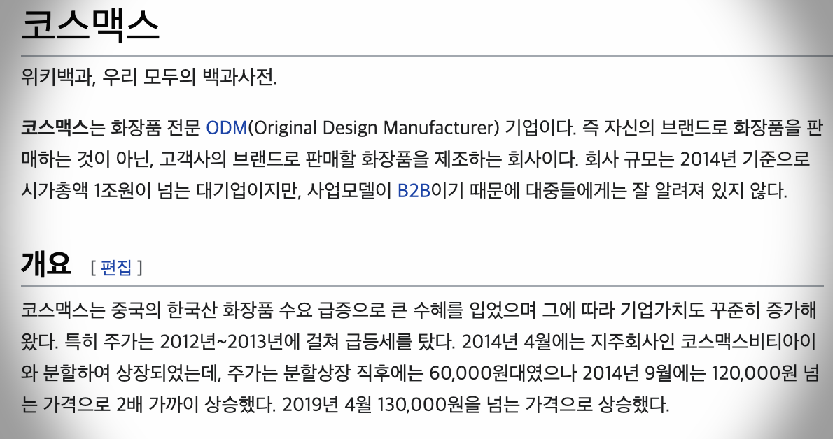 코스맥스는 ODM 위주의 사업으로 일반인에게는 알려져 있지 않지만, 매출이 1조원이 넘는 큰 기업입니다. 노 대표님은 이 기업과 긴밀한 관계가 있다고 기사에서도 언급이 되어 있기도 하고, 노 대표님의 비팩토리 회사가 이곳에 입주해 있기도 합니다.