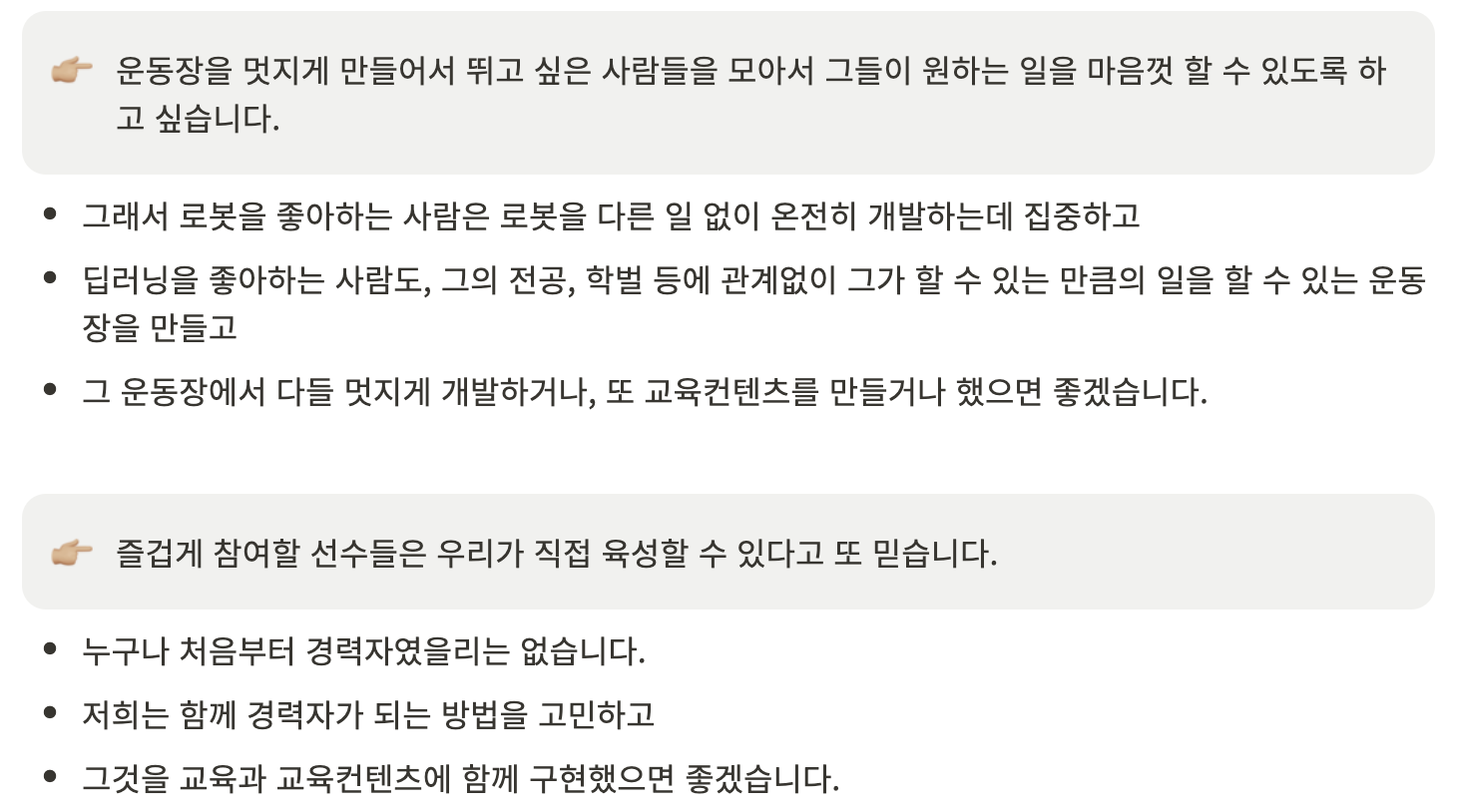 사실 저는 함께 좋은 사람들과 즐겁게 일할 수 있는 운동장을 만들고 싶습니다.