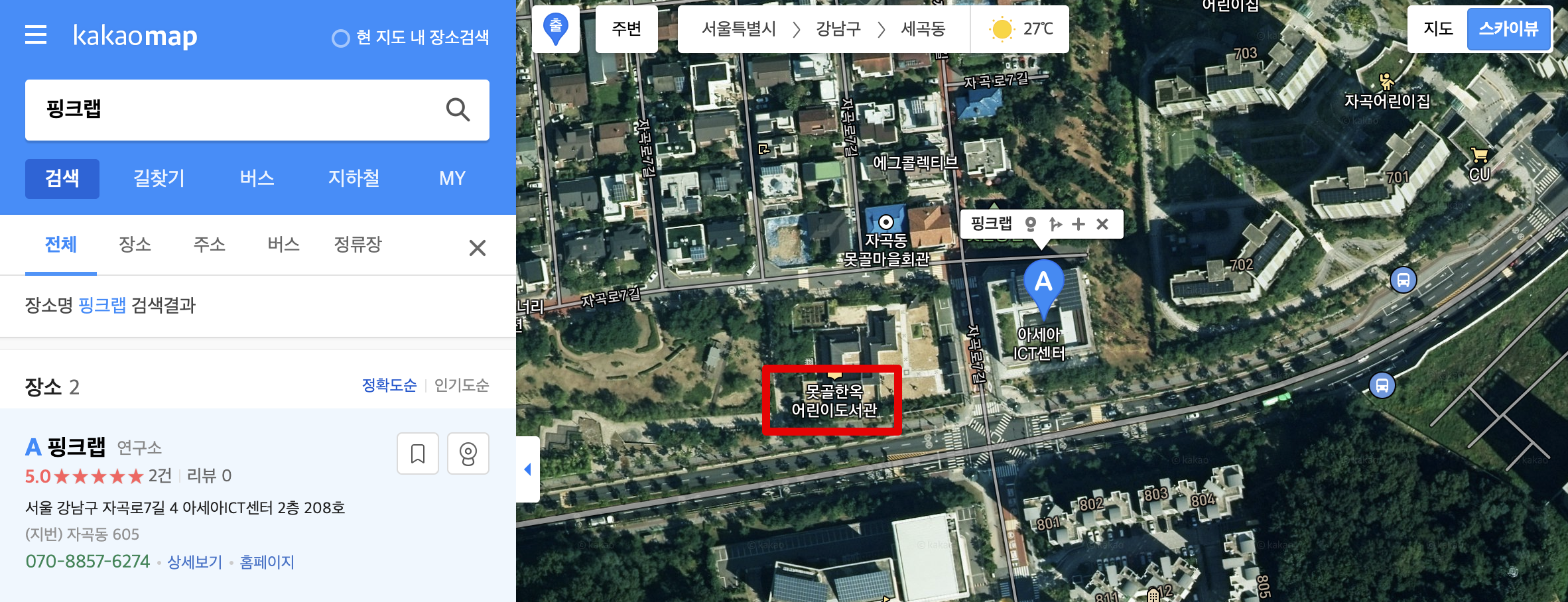 이제 각 종 지도 사이트에서는 핑크랩이라고 검색하면 나타납니다.^^. 뭐 동일 이름의 다른 회사도 있지만요^^. 아무튼, 핑크랩 옆에 못골 한옥 어린이 도서관이라는 곳이 있습니다.
