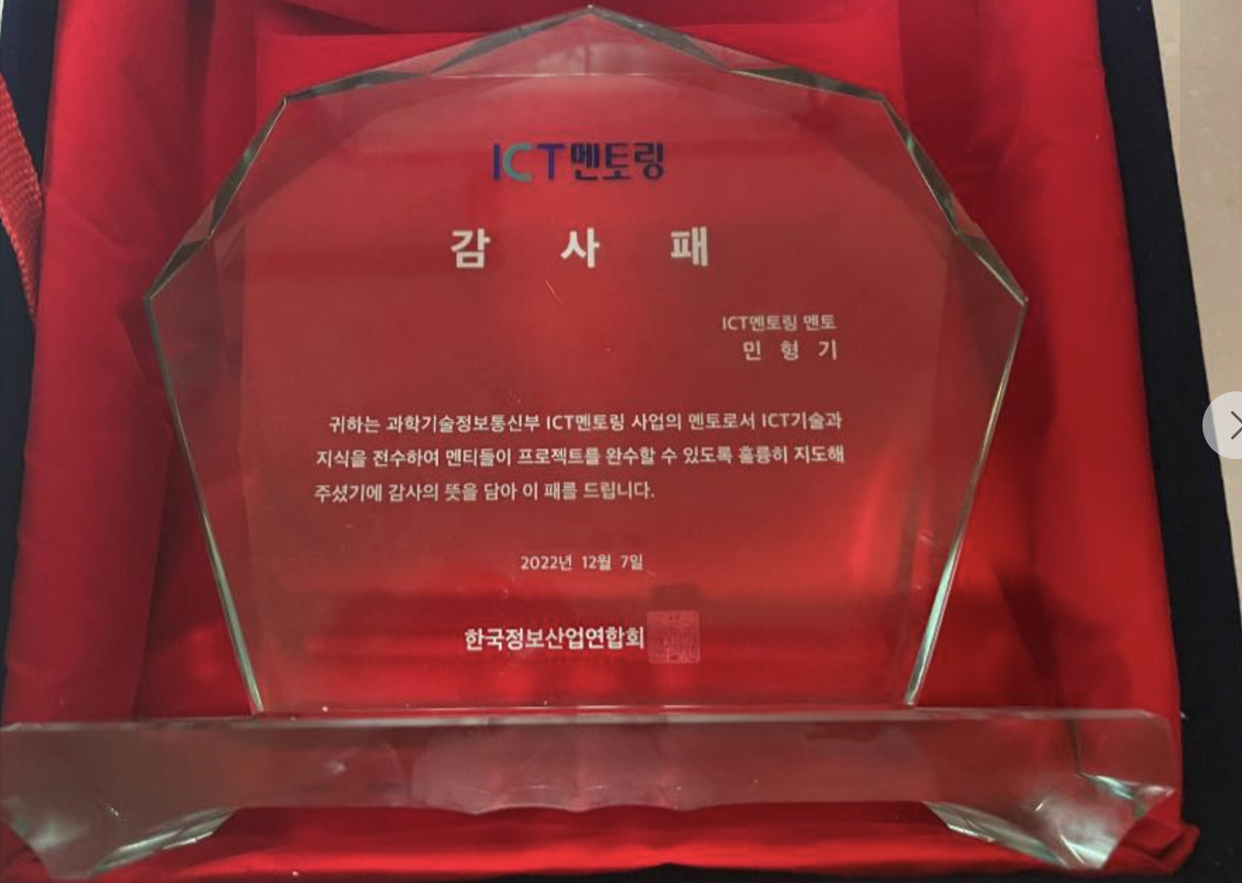 어떤 지인분의 소개로 알게된 학생들을 멘토링했을 뿐인데, 정보산업연합회로부터도 감사패를 받게 되었네요.