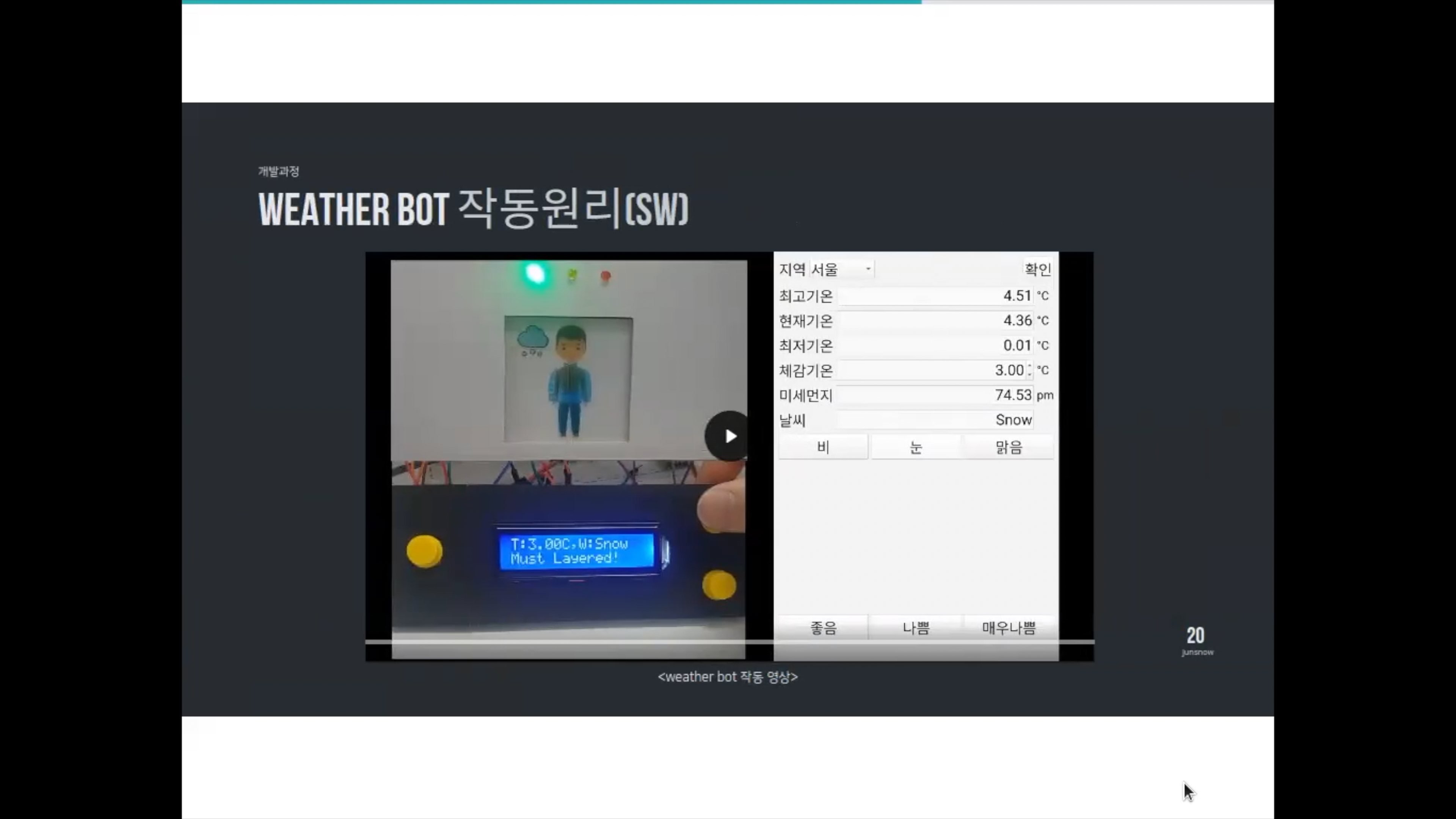 오늘은 날씨에 맞춰 환기도 하고, 옷도 추천해주고, 우산도 챙기라고 알려주는 스마트홈 시스템을 만들려고 노력한 제 수업을 들은 한 수강생 팀의 작품을 소개하려고 합니다. 이 수업을 듣고 있는 친구들은 AI 로봇 수업을 현재 듣고 있는 친구들입니다.