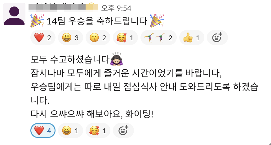 모든 팀이 활발하게 슬랙을 사용한 것은 아니지만, 본인들의 대화와 저와의 대화 도구를 슬랙을 했던 의도대로 점점 시간이 갈 수록 슬랙 참여가 많아졌습니다. 그로 인해 팀별 고민들을 알 수 있게 되고, 비버웍스측의 목적을 전달하는 과정을 보다 쉽게 할 수 있었습니다. 또 저는 참가팀들에게 먼저 다가가기도 하고, 활발히 질문하는 팀들은 또 적극적이어서 꽤 많은 시간을 화상회의를 대회전부터 하기도 했습니다. 참가팀들의 고민을 보면서 어떻게 본대회를 준비해야하는지도 생각할 수 있는 기회이기도 했습니다.