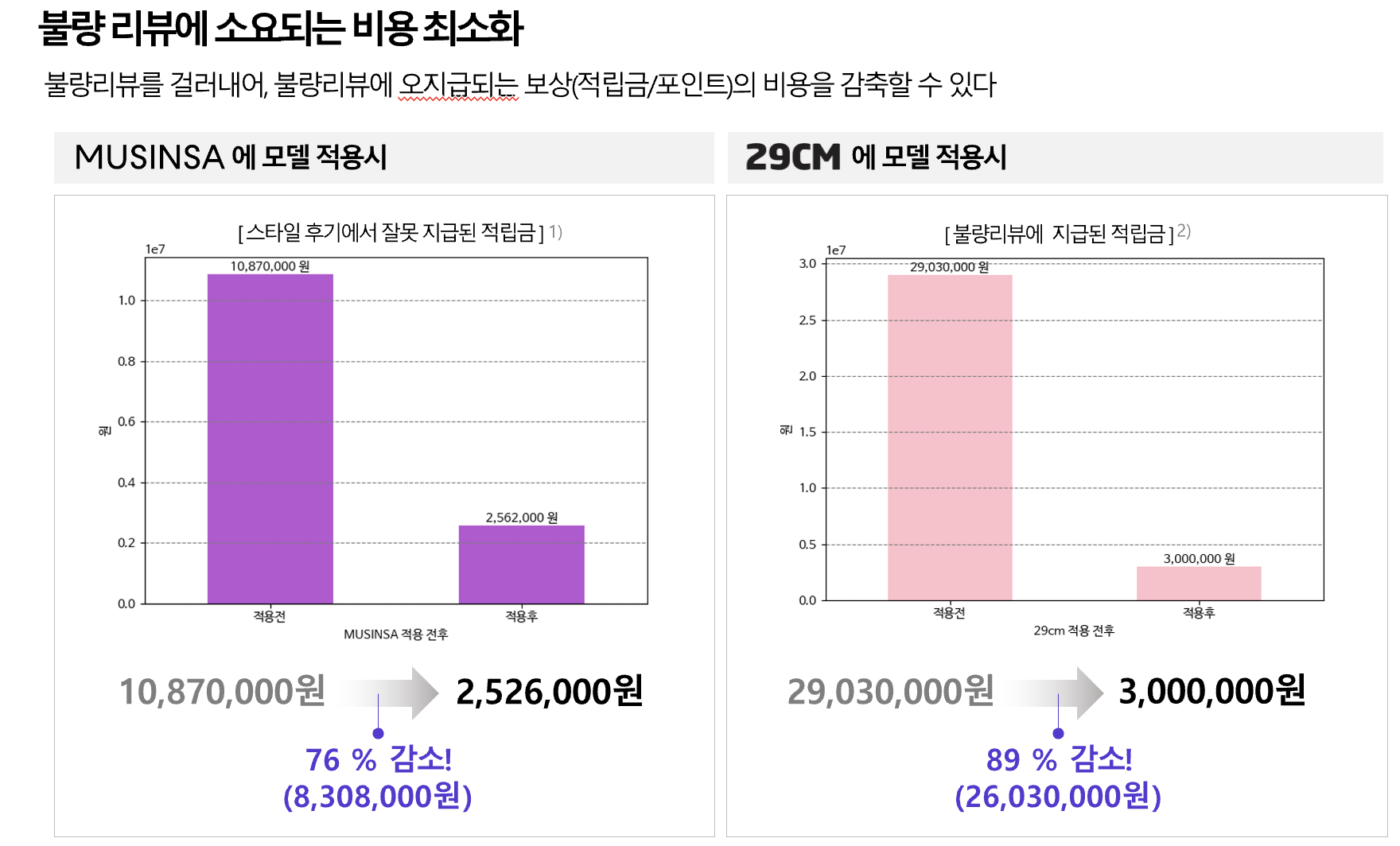 많은 데이터를 분석하고 모델을 만들어서 다시 역계산했을때 무신사의 경우 잘못 지급된, 즉 불량 리뷰가 정상인줄 알고 지급한 적립금을 감소시킬 수 있다는 것을 알 수 있습니다. 무신사는 관리를 잘하니까 비용이 적을 수도 있지만, 29CM의 경우는 그 단위가 높습니다. 그럼. 이 시점... 이 팀이 한 성과는 29CM와 같은 곳에서 더 필요할 수 있겠네요^^
