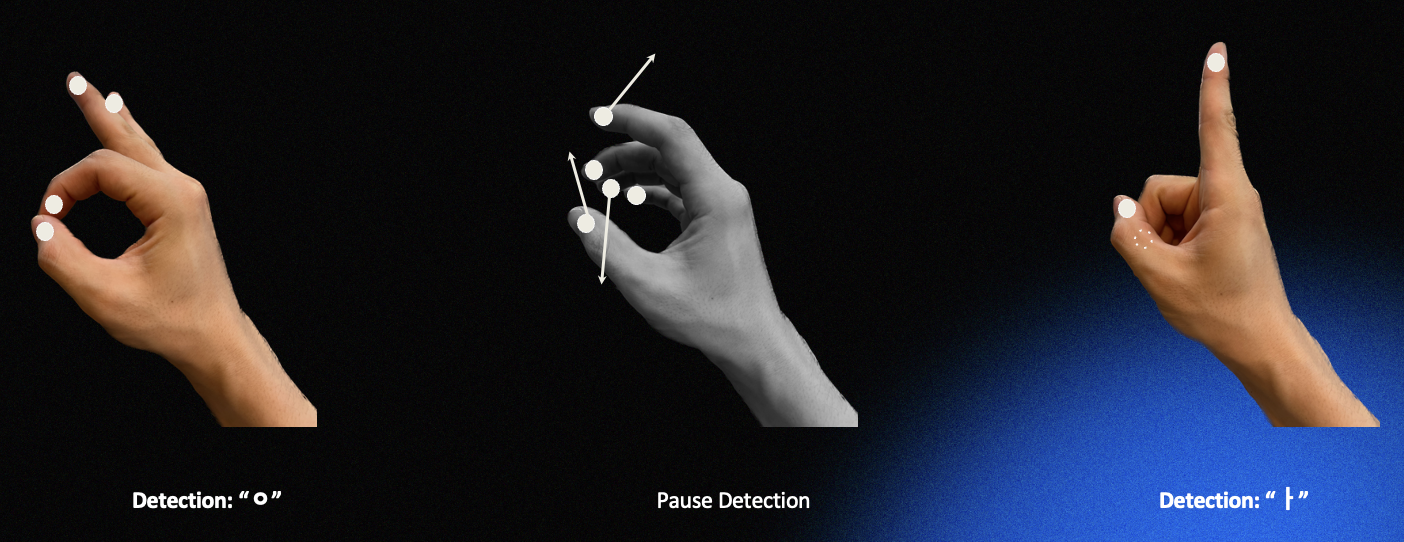 여기서 한 가지 중요한 것... 영상에서 인식해야하므로, 지문자와 지문자 사이의 중간 행동은 인식을 하면 안된다는 것이었는데요. 이 부분을 이 팀은 land mark의 속도가 일정 값 이하인 상황이라고 설정했습니다. 그래서 영상, 카메라를 통해서도 바로바로 잘 인식되도록 된 거죠.