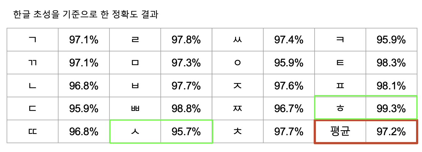 위 정확도는 'ㅅ'의 경우 자음 'ㅅ'의 인식 정확도가 아니라, 'ㅅ'으로 시작하는 모든 글자에 대한 정확도입니다.