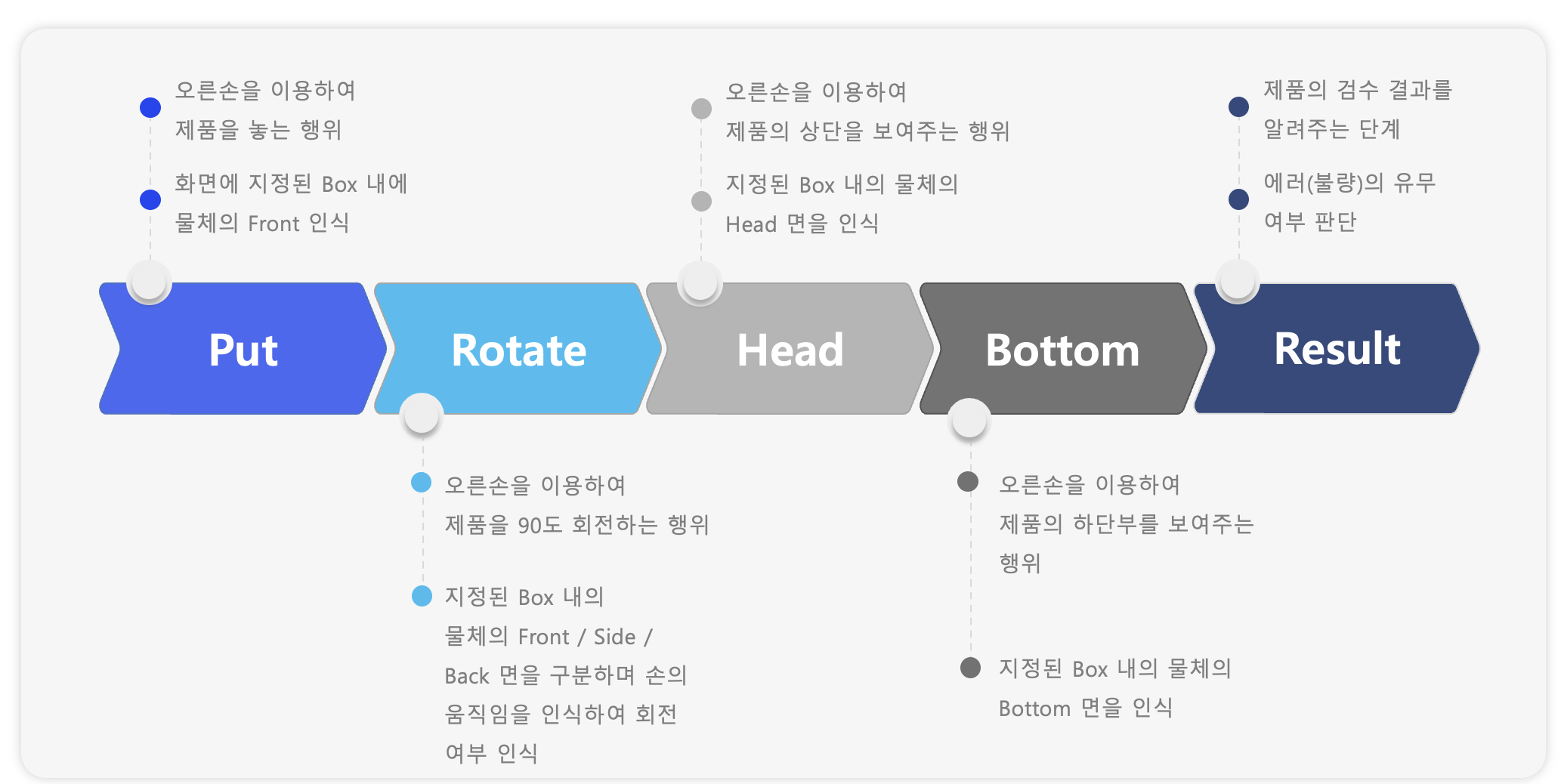 안녕하세요. 이번에도 제가 제로베이스 데이터사이언스 스쿨에서 수업을 진행한 팀의 업적(?)을 도 하나 소개하려고 합니다. 이번 팀은 작업의 절차를 인식하려고 노력한 팀입니다. 물건을 놓아라, 돌려라 등의 행동을 인식해서 모델이 작업자가 가이드에 맞춰 잘 작업을 진행하고 있는지 그리고 대상 물건은 정상인지 등을 확인하는 모델을 만들려는 것입니다.
