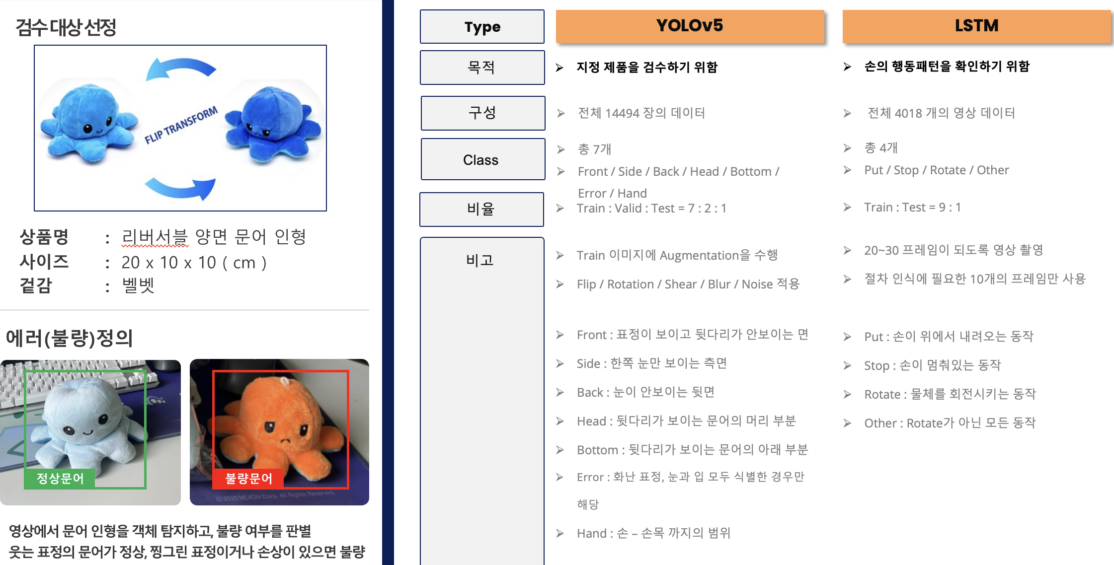 그리고 불량 제품도 선정하구요. 이번 팀은 YOLO로 물체 인식, 미디어파이프로 Pose 인식, 그리고 인식된 pose를 이용해서 행동을 인식하는 것은 LSTM을 사용했습니다.