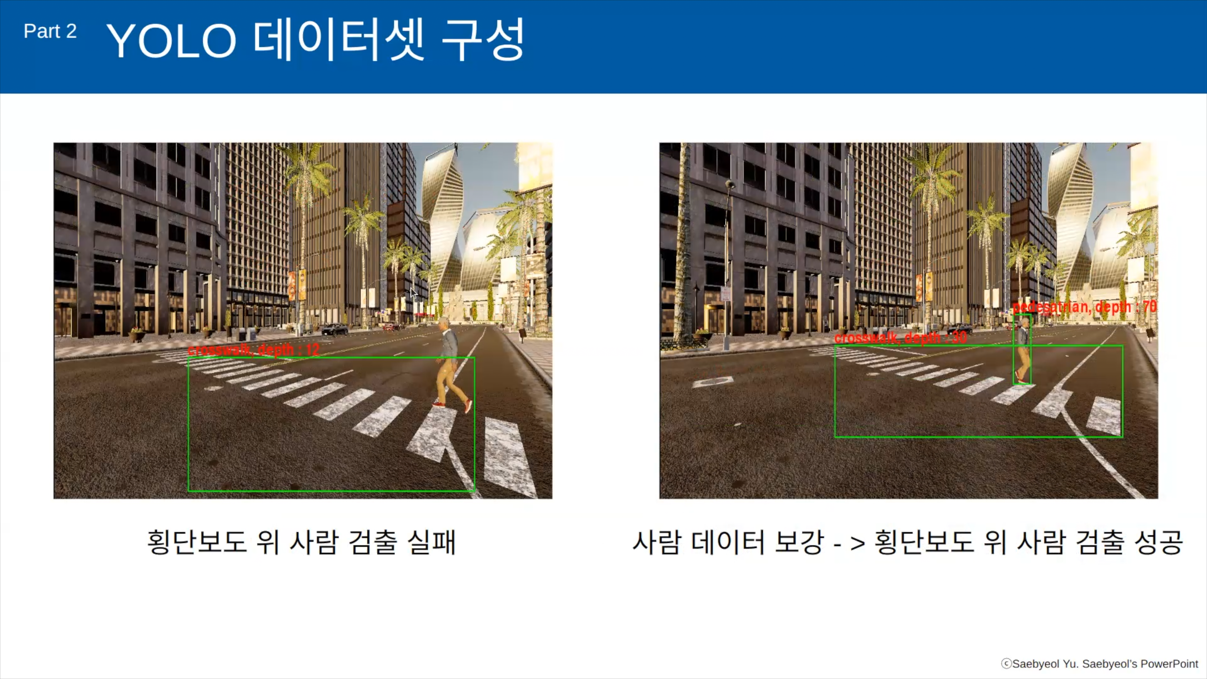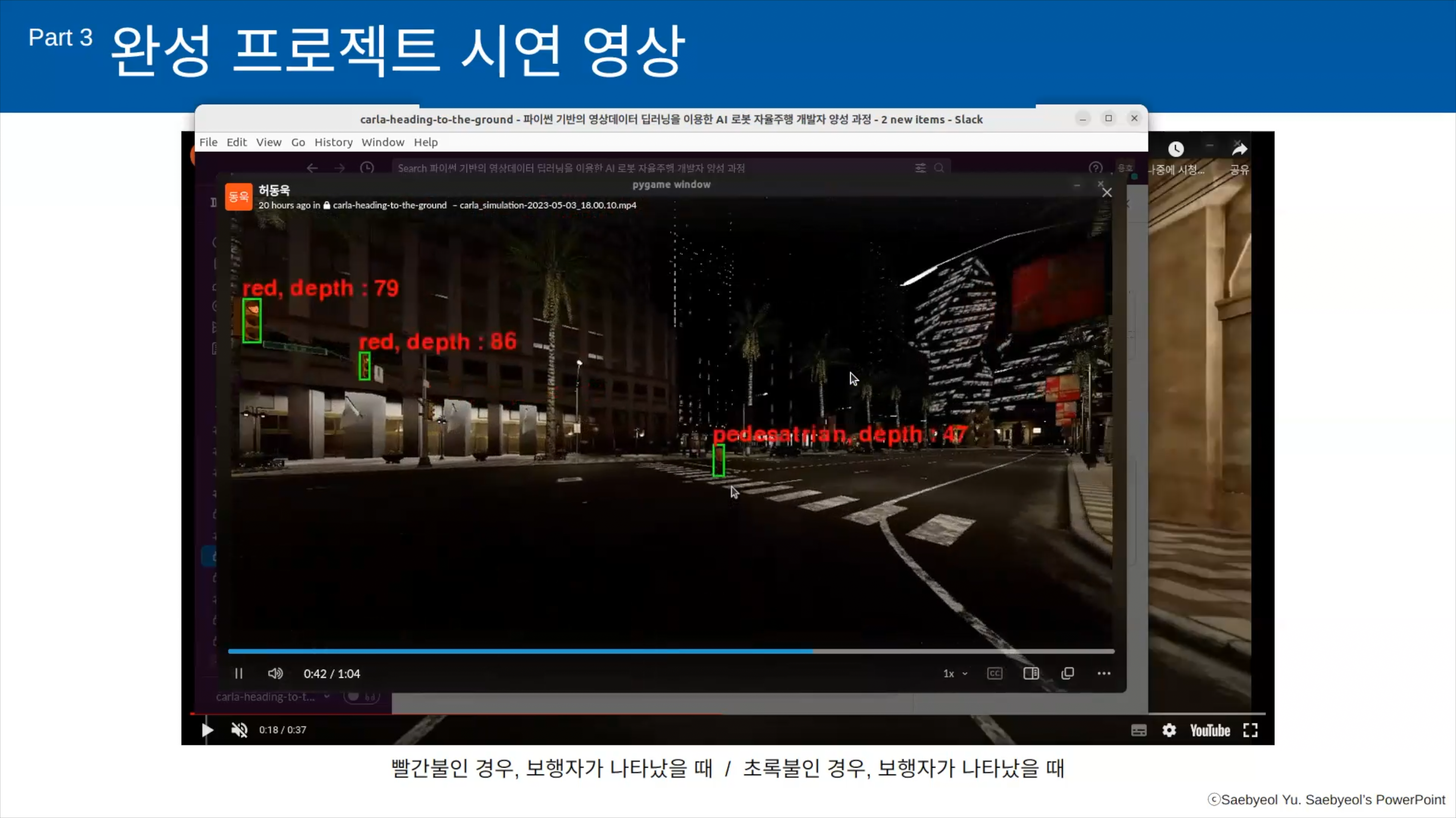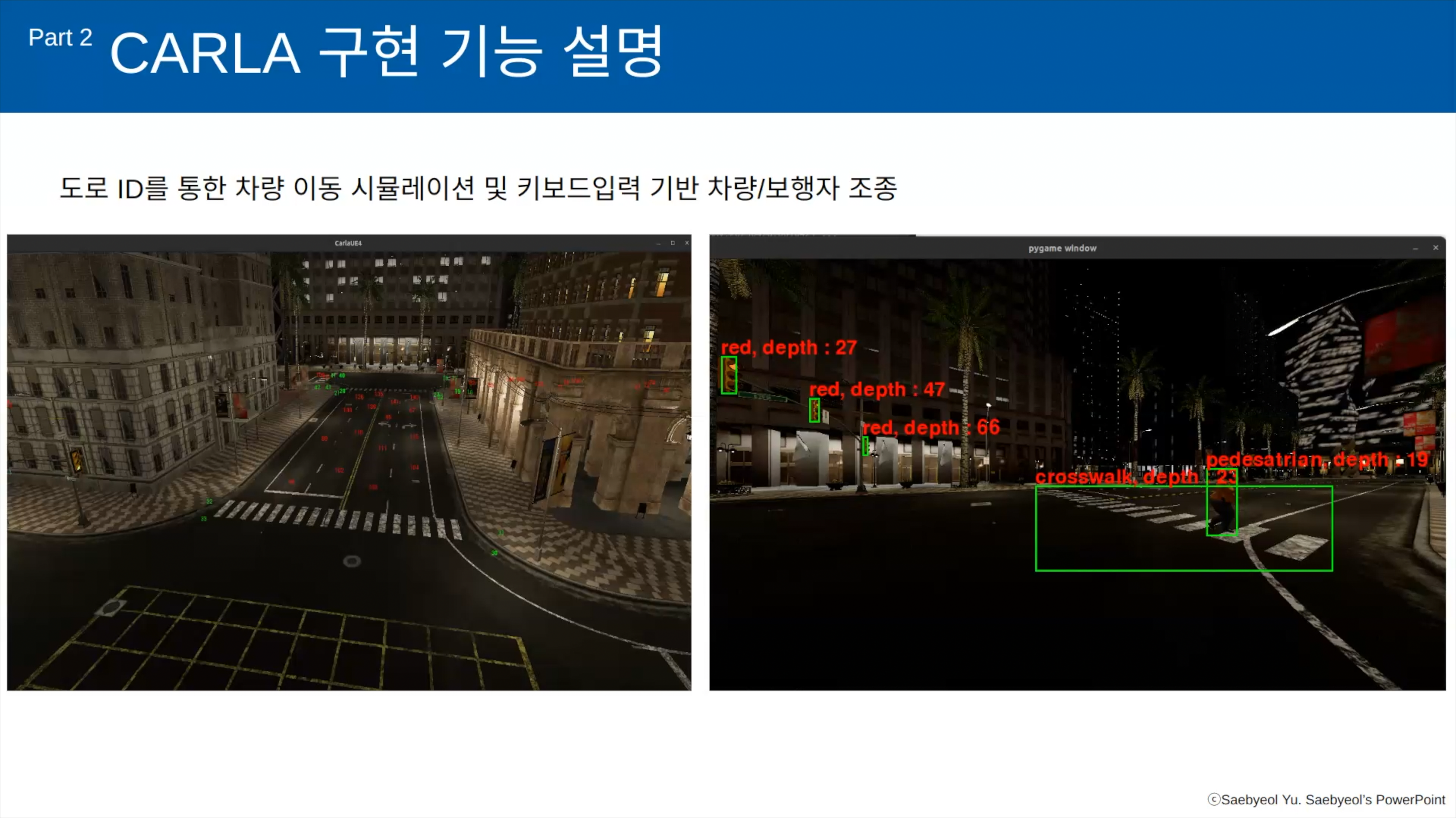 이번에 소개할 것은 제가 진행하는 AI 로봇을 들은 한 수강생 그룹의 프로젝트입니다. 이 친구들은 Carla라고 하는 도로, 차량 시뮬레이션에서 우리나라의 우회전 규정에 맞춰 차량이 우회전을 하도록 구성한 내용입니다. Carla가 직접 사용해보면 잘 안되는 부분들이 있거든요. 이것을 돌파하면서 목적에 맞춰 진행해준 팀입니다.