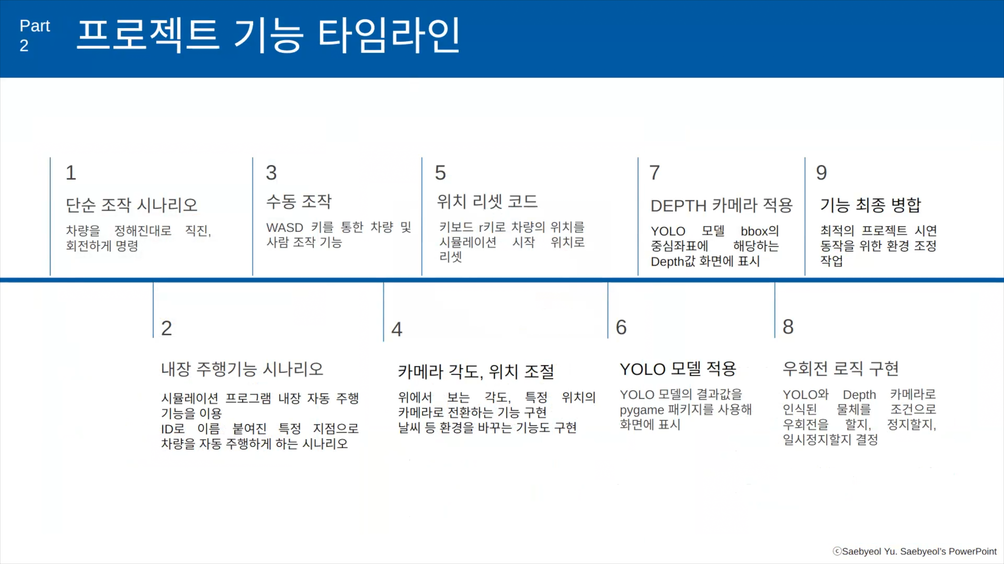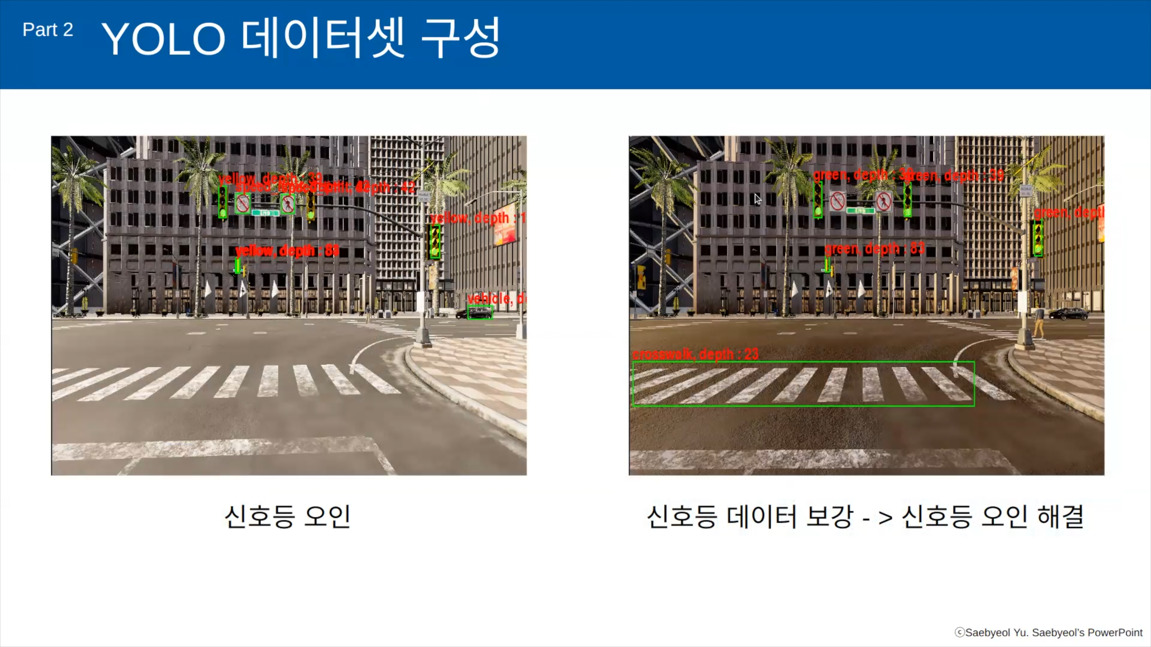 이번에 소개할 것은 제가 진행하는 AI 로봇을 들은 한 수강생 그룹의 프로젝트입니다. 이 친구들은 Carla라고 하는 도로, 차량 시뮬레이션에서 우리나라의 우회전 규정에 맞춰 차량이 우회전을 하도록 구성한 내용입니다. Carla가 직접 사용해보면 잘 안되는 부분들이 있거든요. 이것을 돌파하면서 목적에 맞춰 진행해준 팀입니다.