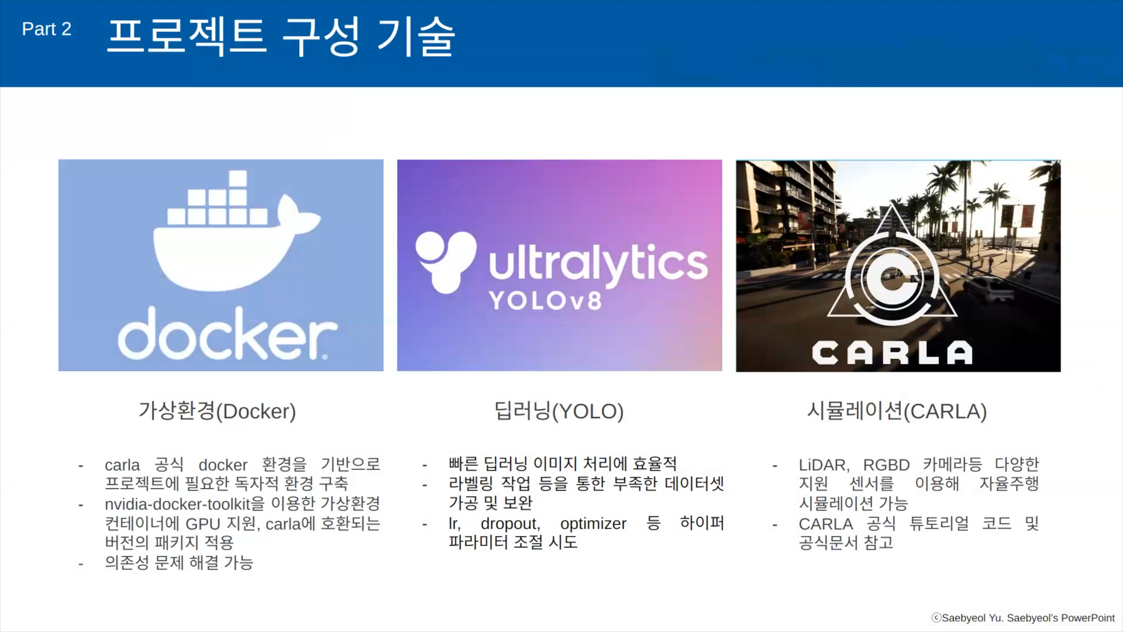 Carla를 사용해보면 Docker는 거의 필수적입니다. 이 팀은 Docker와 Carla와 YOLO를 사용해서 프로젝트를 수행했습니다.