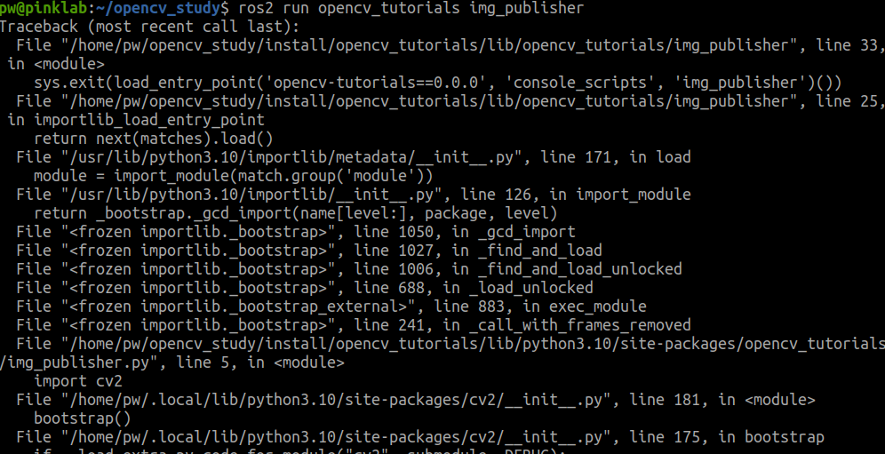 ROS2에서 OpenCV를 사용하기 위해 opencv-python 모듈을 pip로 설치하고, 코드 내에서 import cv2를 넣었는데 그 위치에서 빌드에서는 괜찮았는데 실행할 때 오류가 아래와 같이 나는 경우가 있습니다.