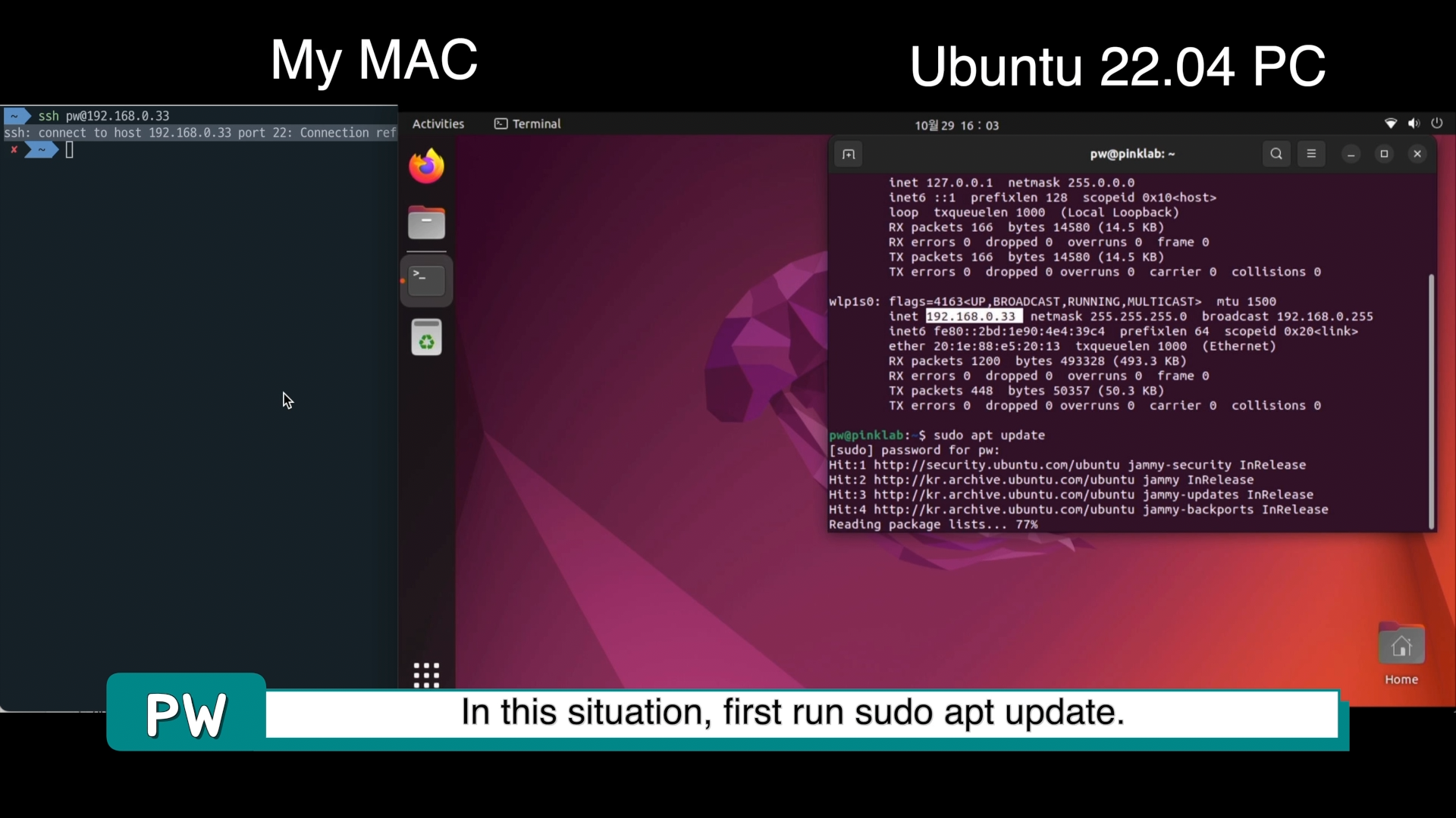 저는 아래 그림처럼 우분투 22.04가 설치된 pc로 제 맥에서 ssh로 접근하려고 하는데요.