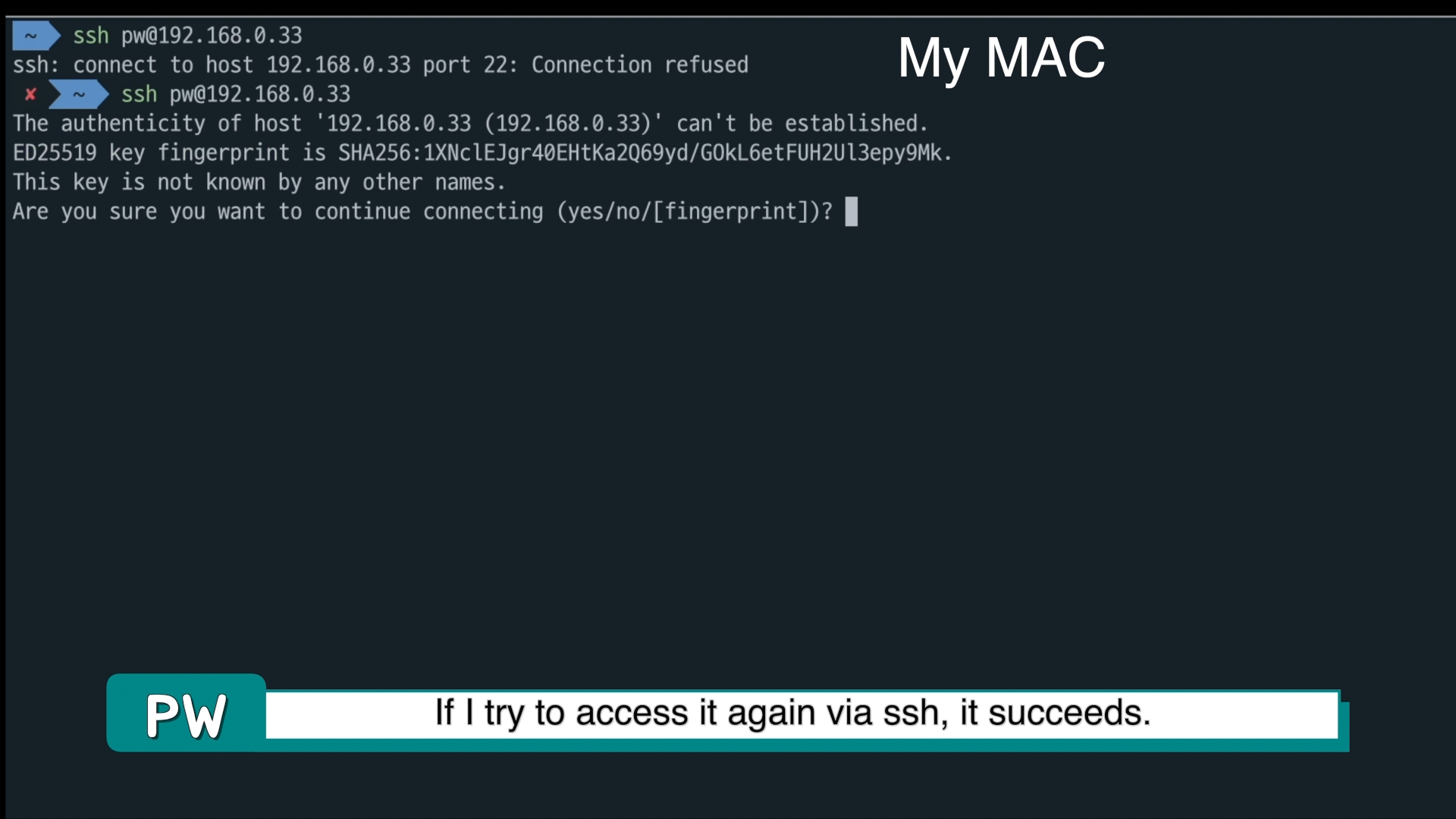이제 다시 접근하면 잘 되네요. SSH 접근이 처음이면, yes라고 입력도 하고,