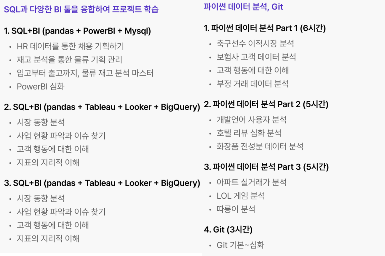 - 데이터 분석 직군의 다양한 BI도구와 Python을 이용한 현장감있는 강의를 위해 현업 개발자로 강사진을 구성