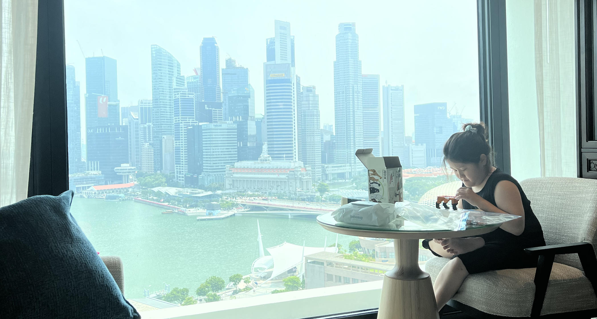 그리고 저 쇼파도 좋았습니다. 아까 이야기드렸지만, 마리나 베이 샌드 호텔이 보이는 풍경이 생각보다 꽤 좋습니다. 오른쪽 작은 손과 레고는 싱가폴 유니버셜 스튜디오를 가서 산 것인데, 저렇게 계속 조립을 하네요^^