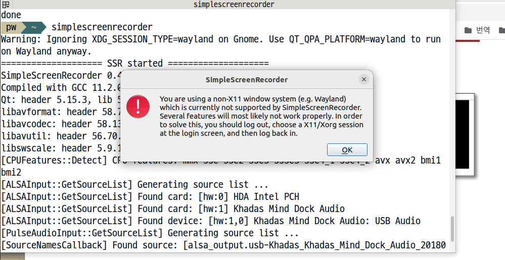 실행을 하면, 위 그림처럼 X11이 아니네? 어쩌고 에러가 납니다. 그건 Wayland와 같은 윈도우 시스템을 사용하기 때문인데요.